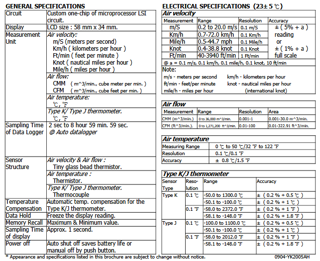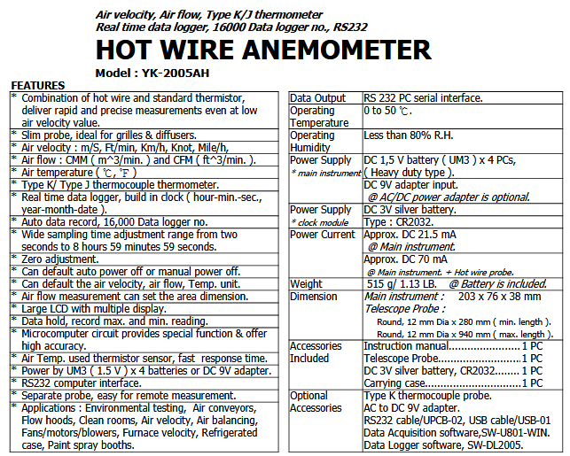 The LUTRON YK-2005AH is an anemometer with telescopic probe, that can measure gas flow rate in range 0,2 - 20,0 m/s and temperature in range -100 - 1300 °C by K-type thermocouple, or in range 0 - 50 °C without external thermocouple. This device is capable of storing measurements to internal memory. Can communicate via RS232 or USB.