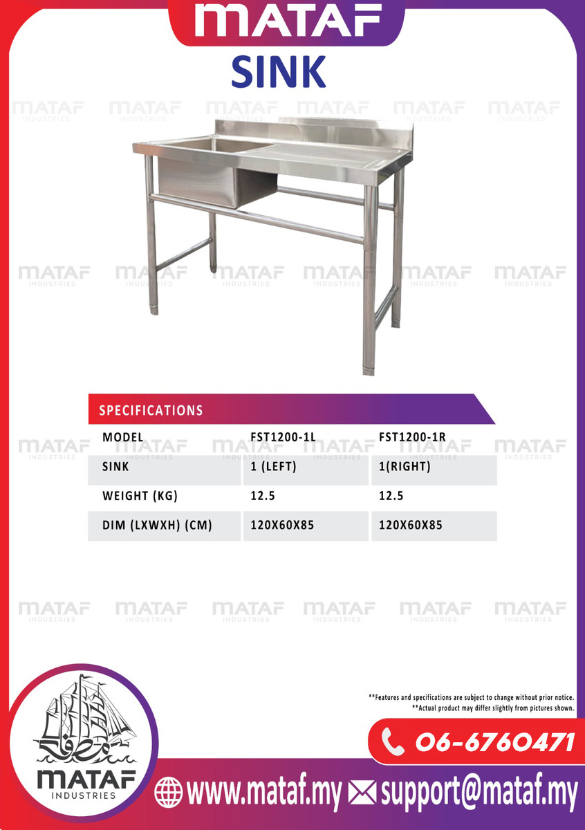 Stainless Steel Commercial Single Bowl Kitchen Sink with Drainboard Side Table (LEFT) FST1200-1L Sink: 1 (Left) Weight (kg): 12.5 Dim (LxWxH) (cm): 120x60x85