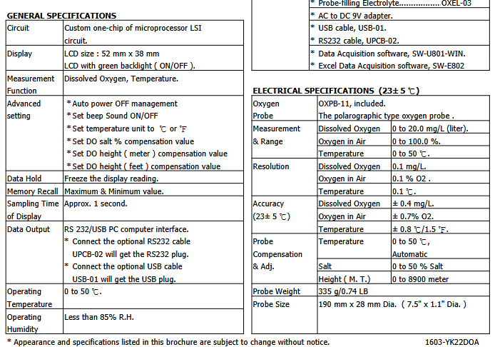 Dissolved Oxygen probe, OXPB-11.........................1 PC