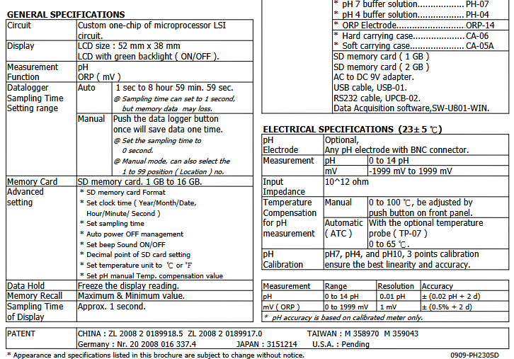 pH: 0 to 14.00 pH, mV (ORP): +- 1999 mV