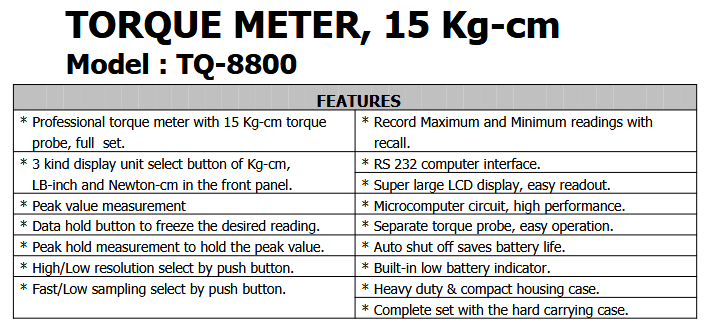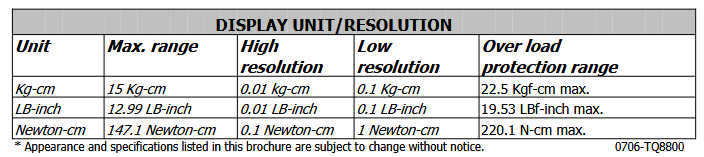 3 units : 15 Kg-cm/13 LB-inch/147.1 N-cm.