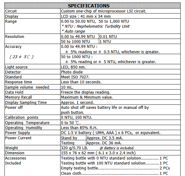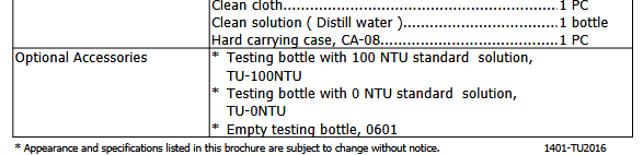 Testing bottle with 0NTU &100 NTU Standard solution, empty testing bottle, AC to DC 9V Power Adapter.