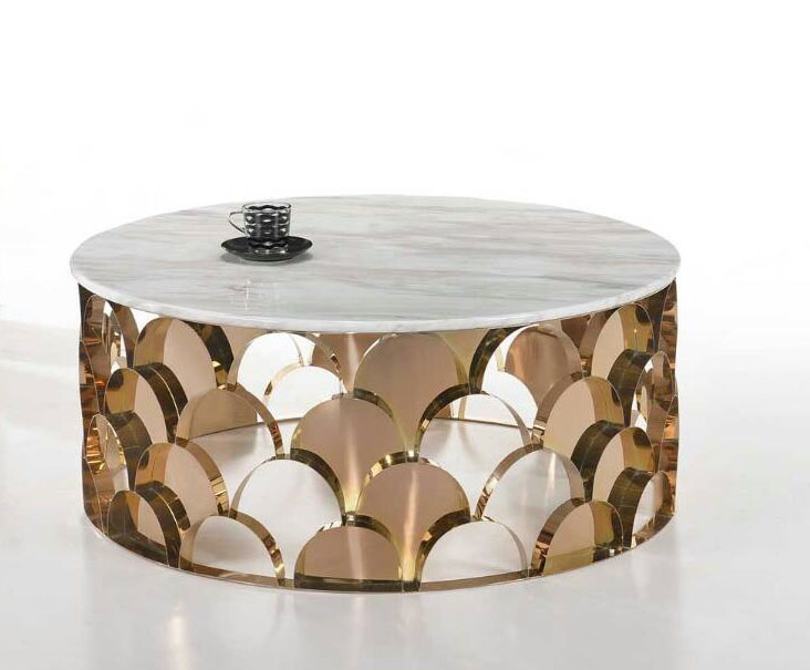 Marble Coffee Table with Stainless Steel Base Dimension Ø900 x H445mm Specification Shape: Round Table Top: Marble Leg: Stainless Steel(Rose Gold)