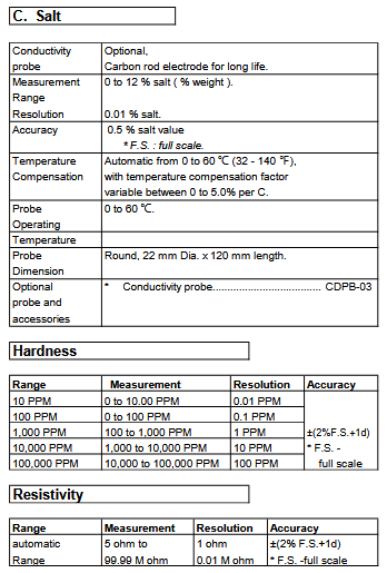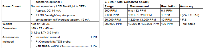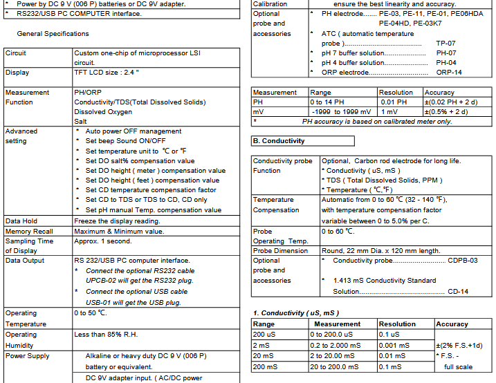 Conductivity : 200 uS/2 mS/20 mS/200 mS.
