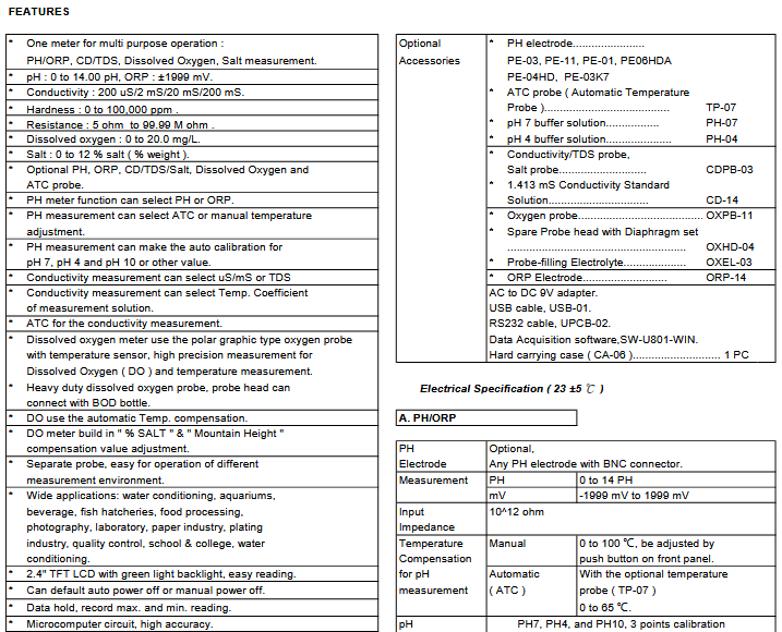 Optional electrodes : pH electrode, ORP electrode, Dissolved oxygen probe, pH ATC probe (TP-07).