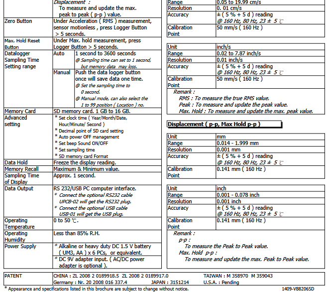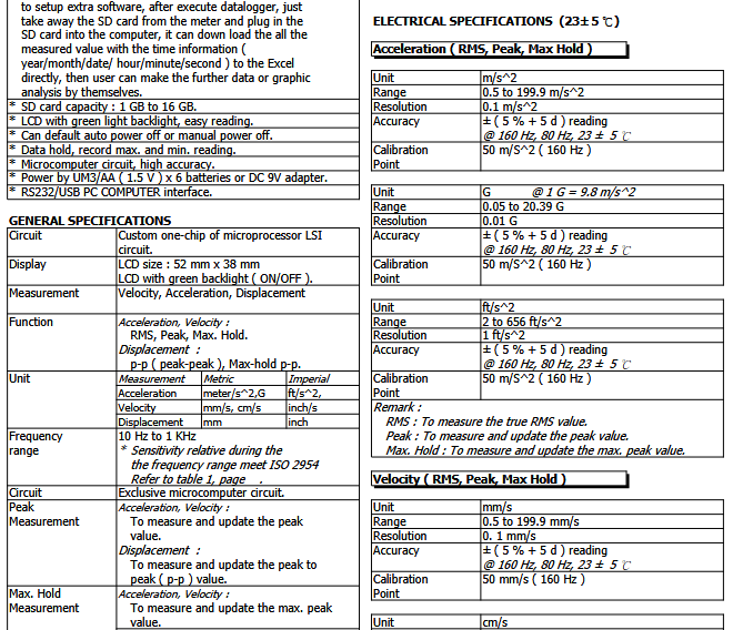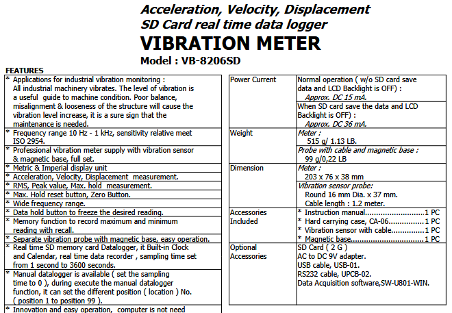 The Lutron VB-8206SD is a vibration meter supplied with external vibration sensor.