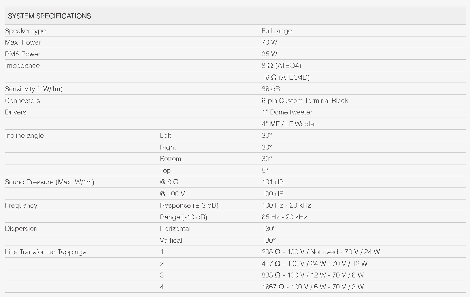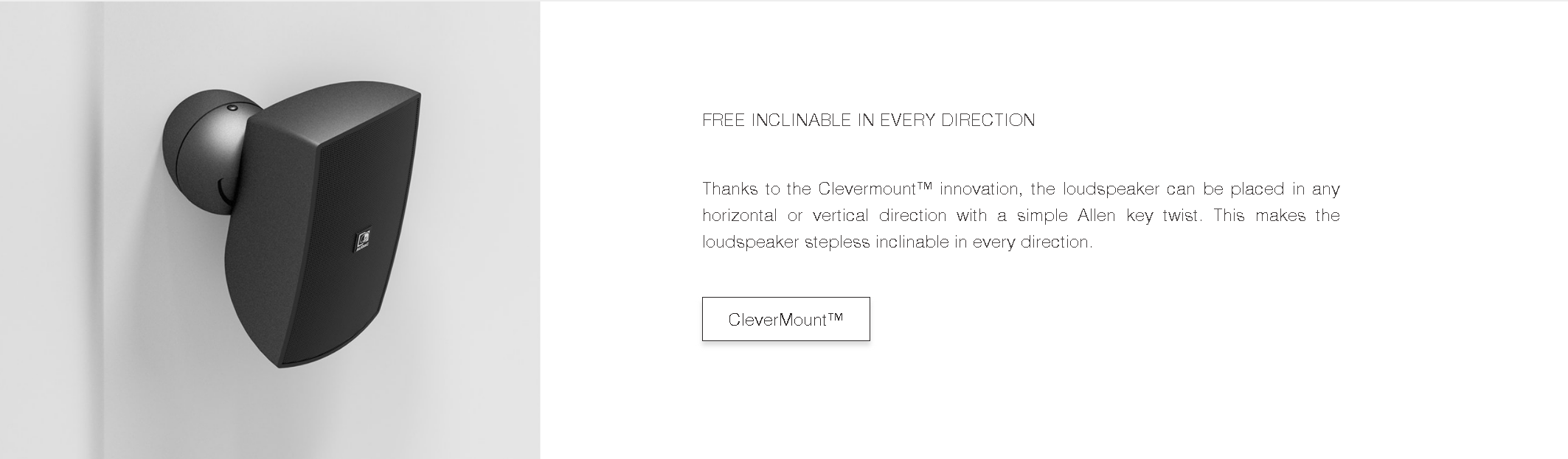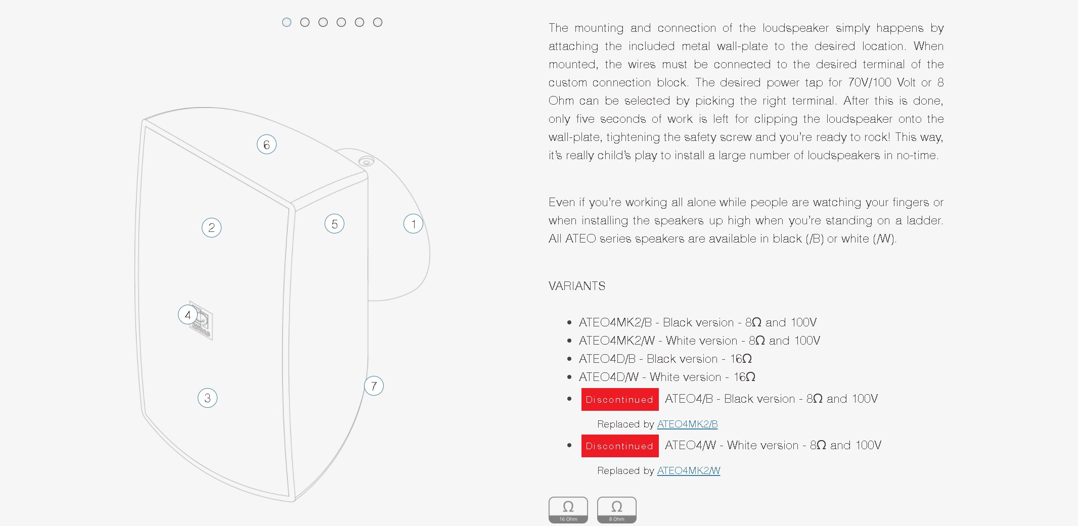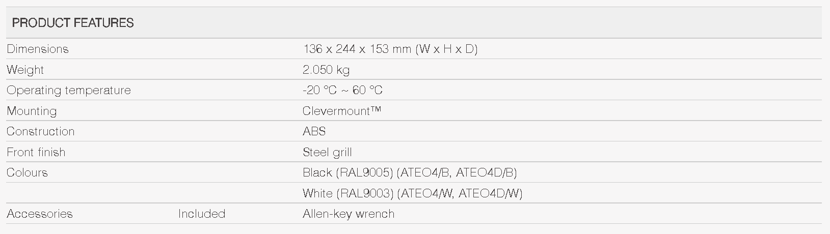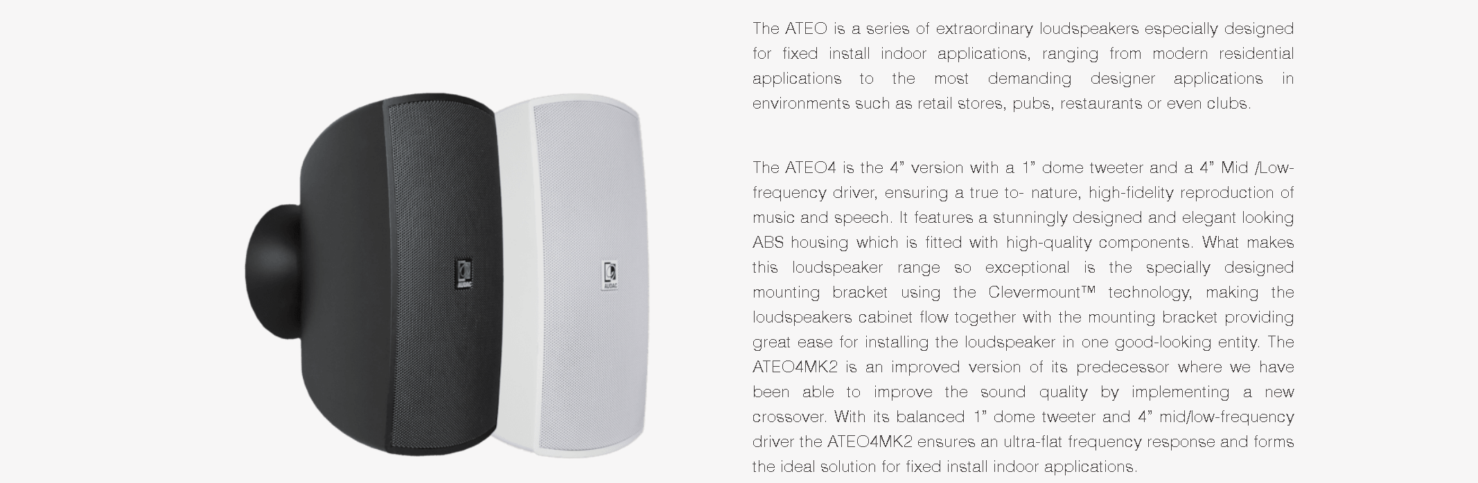 The ATEO is a series of extraordinary loudspeakers especially designed for fixed install indoor applications, ranging from modern residential applications to the most demanding designer applications in environments such as retail stores, pubs, restaurants or even clubs.The ATEO4 is the 4” version with a 1” dome tweeter and a 4” Mid /Low-frequency driver, ensuring a true to- nature, high-fidelity reproduction of music and speech. It features a stunningly designed and elegant looking ABS housing which is fitted with high-quality components. What makes this loudspeaker range so exceptional is the specially designed mounting bracket using the Clevermount™ technology, making the loudspeakers cabinet flow together with the mounting bracket providing great ease for installing the loudspeaker in one good-looking entity. The ATEO4MK2 is an improved version of its predecessor where we have been able to improve the sound quality by implementing a new crossover. With its balanced 1” dome tweeter and 4” mid/low-frequency driver the ATEO4MK2 ensures an ultra-flat frequency response and forms the ideal solution for fixed install indoor applications.