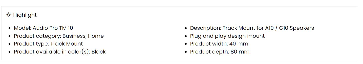 Product Details of Audio Pro TM10 Track Mount For A10 / G10 Speakers / Plug and play design mount - (Black)