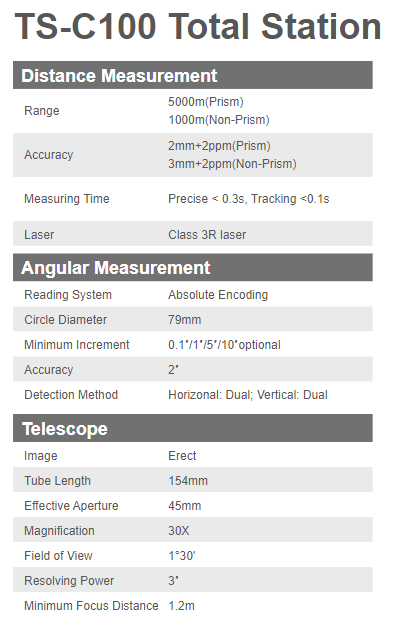 With prism-free measurement technology, the TS-C100 total station can tackle with all kinds tasks even in harsh environment with high speed and high efficiency. Featured programs such as coordinate measurement, angle measurement, traverse measurement, road design and area calculation, it's your most cost-effective choice for surveying and inspections, building construction and civil engineering and other applications.
