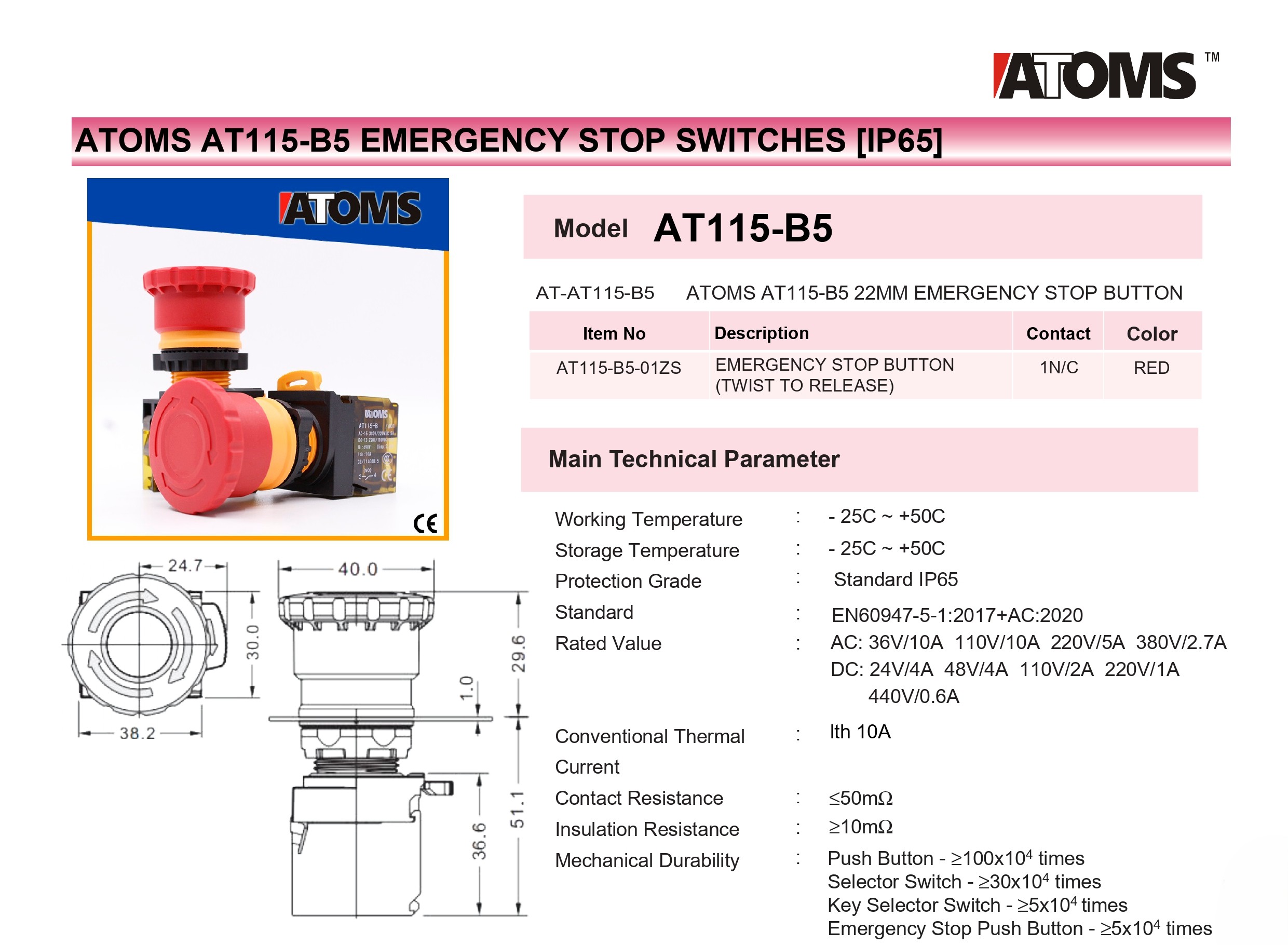 ATOMS AT115-B5 Emergency Stop Switches (IP65)