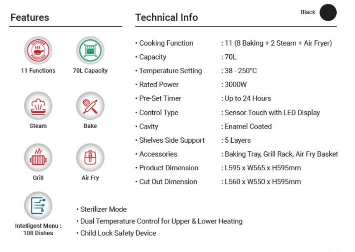 11 Cooking Modes (8 Baking + 2 Steam Functions + Air Fryer)