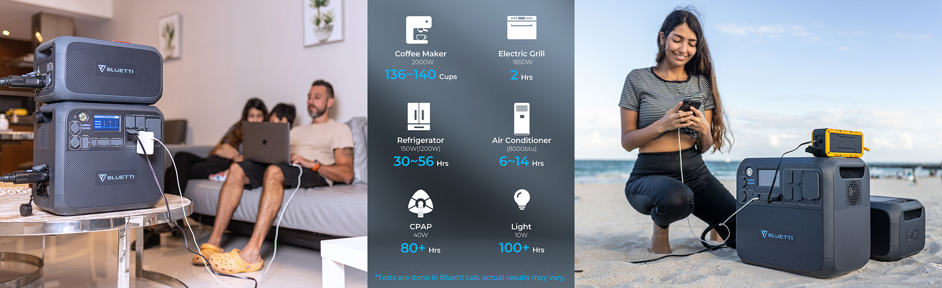Struggling between power and flexibility? We got you covered! With two expansion ports, The AC200MAX welcomes up to two BLUETTI B230’s(2048Wh each) or B300(3072Wh each) battery modules, connecting of which can boost the total capacity to a staggering 8192Wh!
