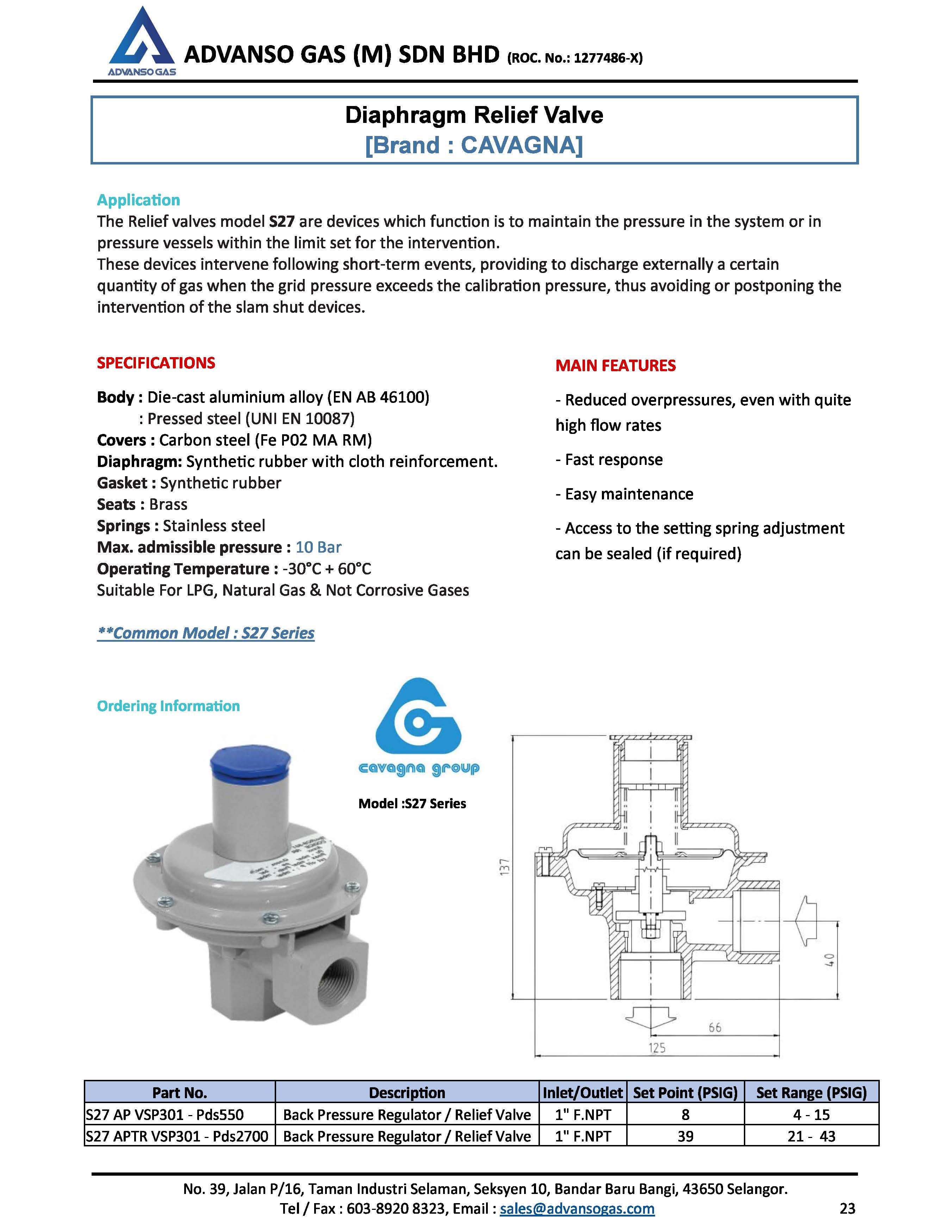 CAVAGNA - DIAPHRAGM RELIEF VALVE S27 SERIES