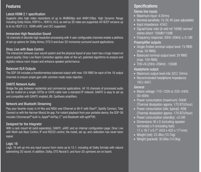 JBL SDP 58 16 Channel Surround Sound AV Preamplifier