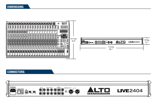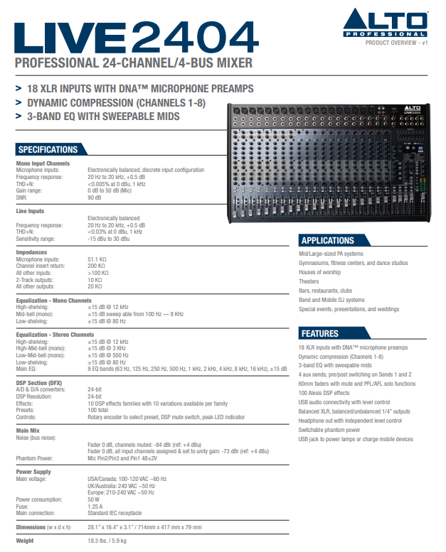 The Alto Professional Live 2404 is a pro 24-channel, 4-bus mixer equipped with the tools you need to create the perfect mix. With flexible routing options and a multitude of onboard DSP tools, Live 2404 fits the demands of nearly any live performance environment. It features 18 balanced XLR inputs with switchable phantom power, 3-band EQs with sweepable mids for additional tonal shaping, four aux sends per-channel for external effects and monitoring, and a 9-band graphic EQ for main or monitor outputs. A headphone jack with an independent level control enables additional monitoring and mixing. 60mm faders with LED meters provide precise control and visual feedback for accurate, hands-on mixing. With its diverse connectivity options, Live 2404 can handle any sized event from small coffee house gigs to mid-sized ensembles to full-stage rock bands.