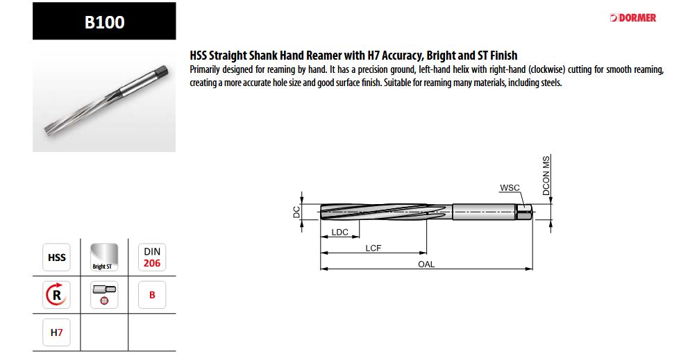 B100 HSS STRAIGHT SHANK HAND REAMERS
