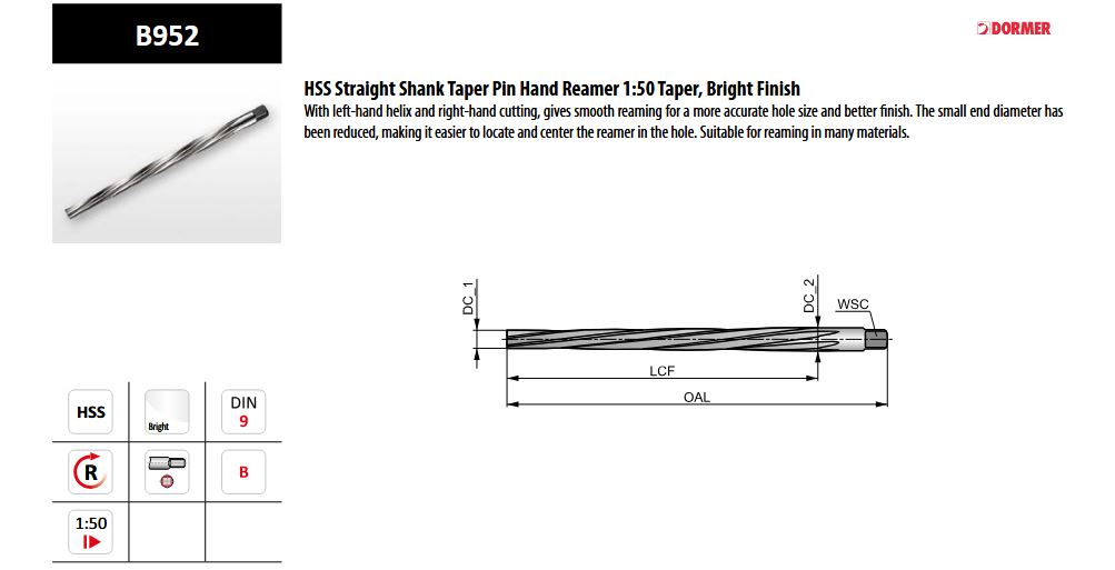 B952 HSS STRAIGHT SHANK TAPER PIN HAND REAMER