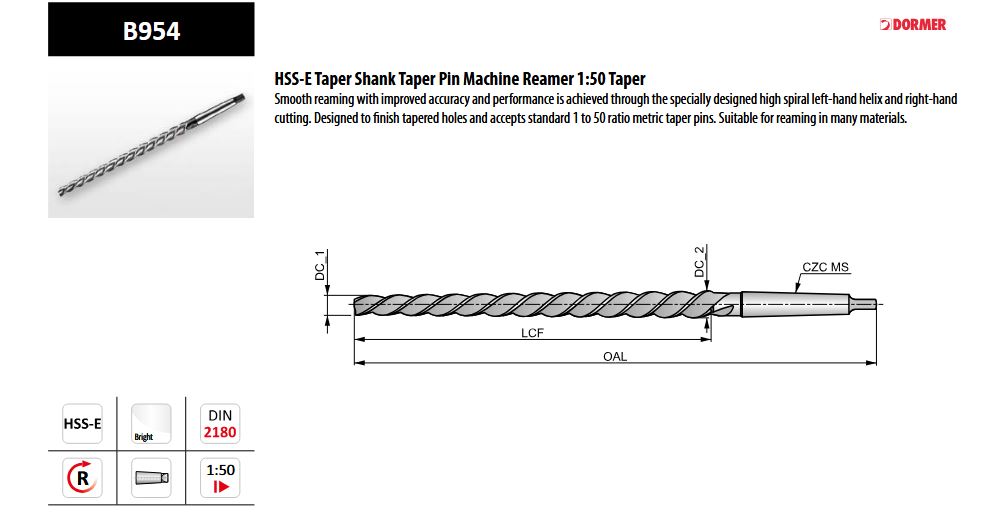 B954 HSS-E TAPER SHANK TAPER PIN MACHINE REAMER