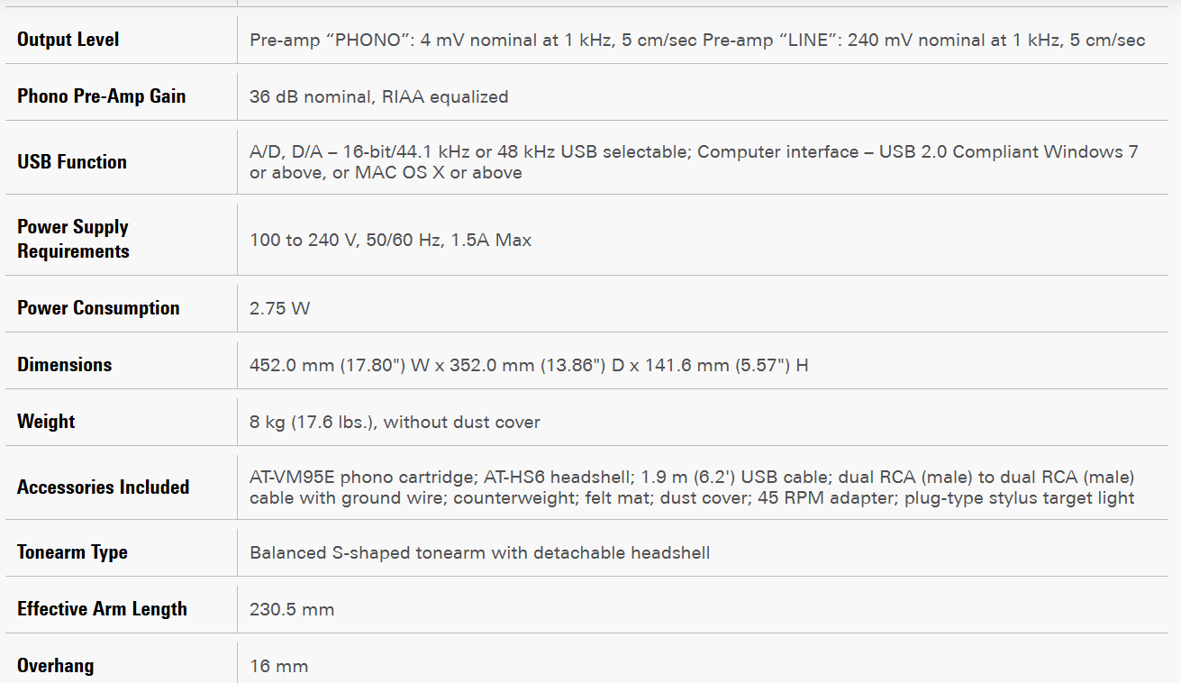 The turntable also features an S-shaped tonearm with adjustable tracking force and an AT-HS6 universal ½''- mount headshell with an AT-VM95E Dual Moving Magnet™ phono cartridge. Audio-Technica has been a leader in phono cartridge design for more than 50 years, and that expertise shows in the versatile, high-performance AT-VM95E. The cartridge comes with a 0.3 x 0.7 mil elliptical stylus, but is also compatible with any VM95 Series replacement stylus, offering a wide choice of options for every budget and application.