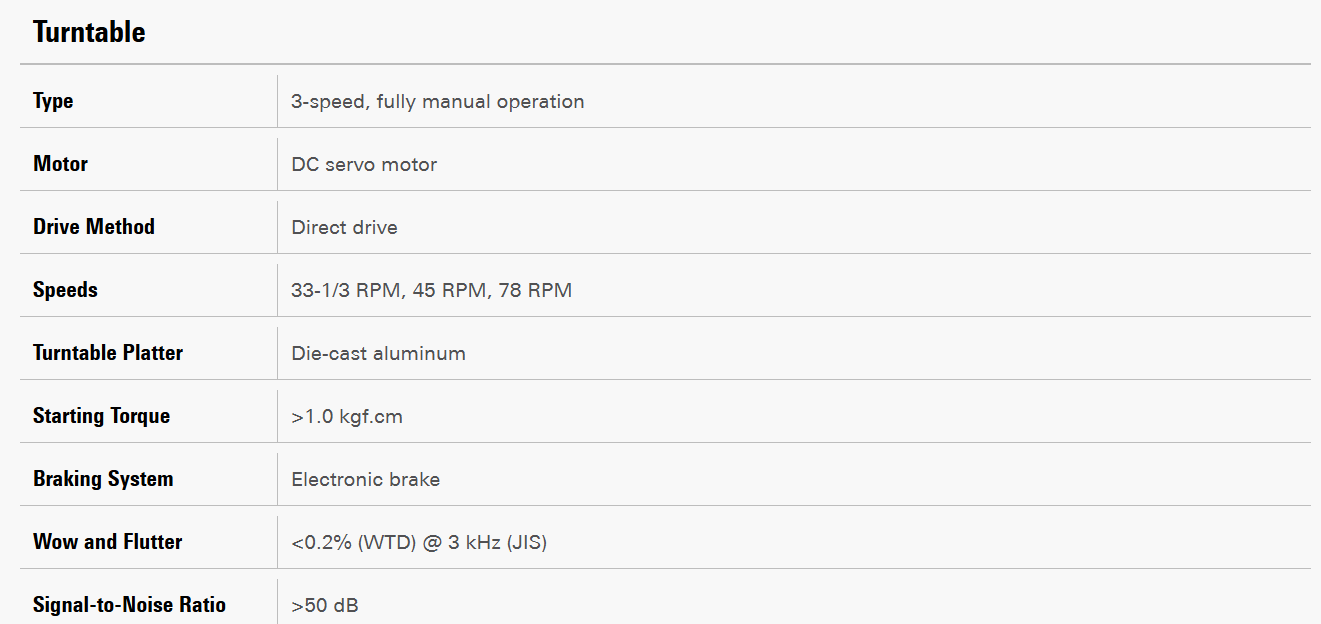 Additional professional features include a die-cast aluminum platter with felt mat; a start/stop button; selectable high-accuracy quartz-controlled pitch lock and pitch change slider control with +/-10% adjustment range; a stroboscopic platter with speed indicator; a removable plug-type stylus target light; external power supply; and a removable hinged dust cover.