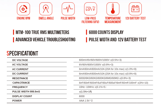 MTM-100 is a highly reliable and safe True RMS automotive multimeter. The meter adopts high resolution A/D converter and microcontroller data processing technology, with large digital display, full range overload protection and unique appearance design, making it a efficient and safe tool for vehicle maintenance and repairing. It can be used to meassure: AC/DC current and voltage, Resistance, Capacitance, Diode/Transistor, Circuit On/Off, Temperature/Frequency, Dwell angle 1-8CYL, RPM 2STR/4STR, Pulse width and 12V battery test, VFC Low-pass filtering, Maximum and minimum value/relative value etc.