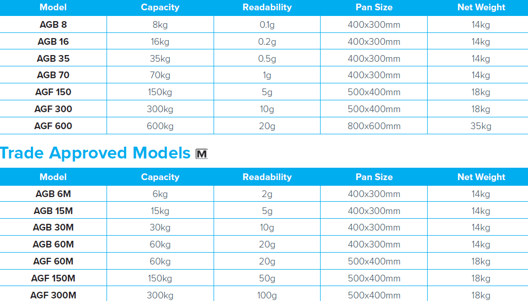 Easy to operate AGB and AGF stainless steel scales are well-suited for use in warehouses, shipping and receiving areas, factories and production facilities. The scales offer capacities from 8kg to 600kg and perform a variety of weighing tasks. Featuring an internal rechargeable battery, the AGB/AGF can be used in locations where power is unavailable.