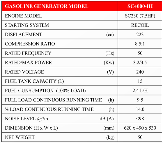 SENCI SC4000-III Gasoline Generators SC230 (7.5HP) 223cc 3.5kW 50hz 240V 15L C003