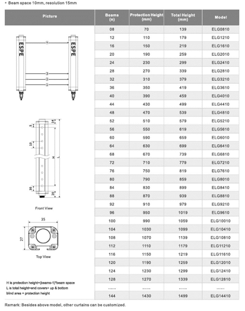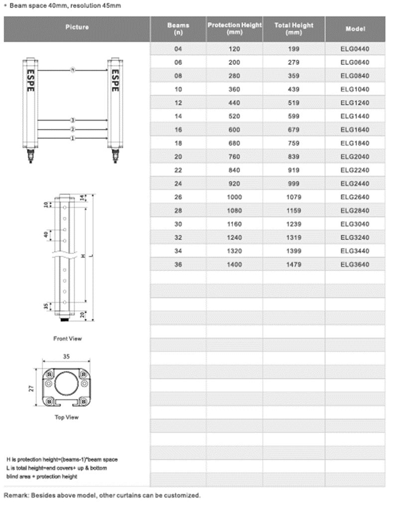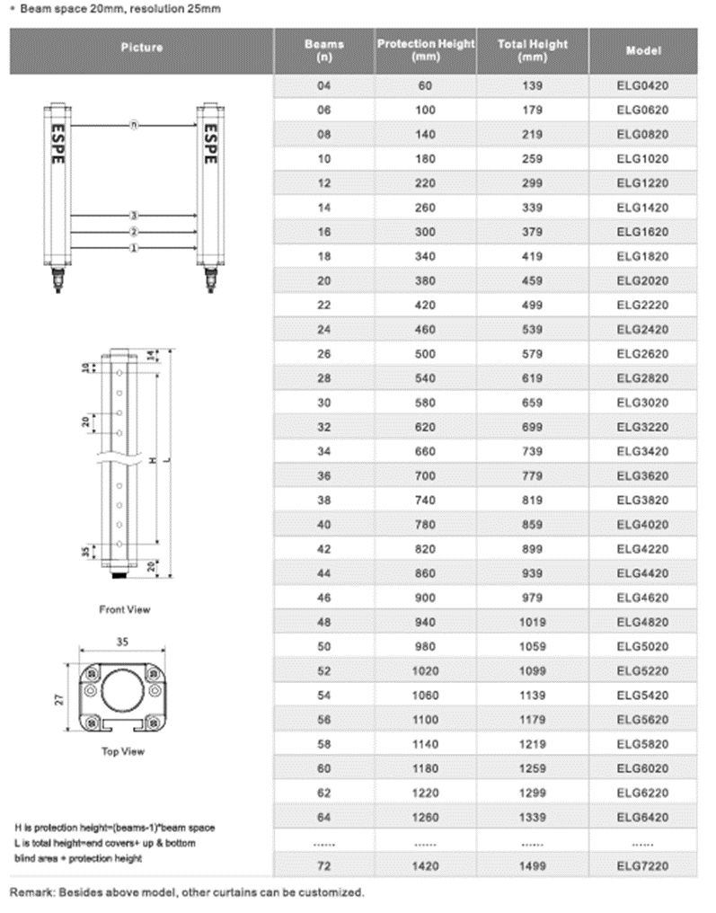 ELG series is suitable for various automation equipment for its compact size. High resolution, long sensing distance, dual independent loop and self-diagnosis & cross-diagnosis for high safety performance.Specifications :
