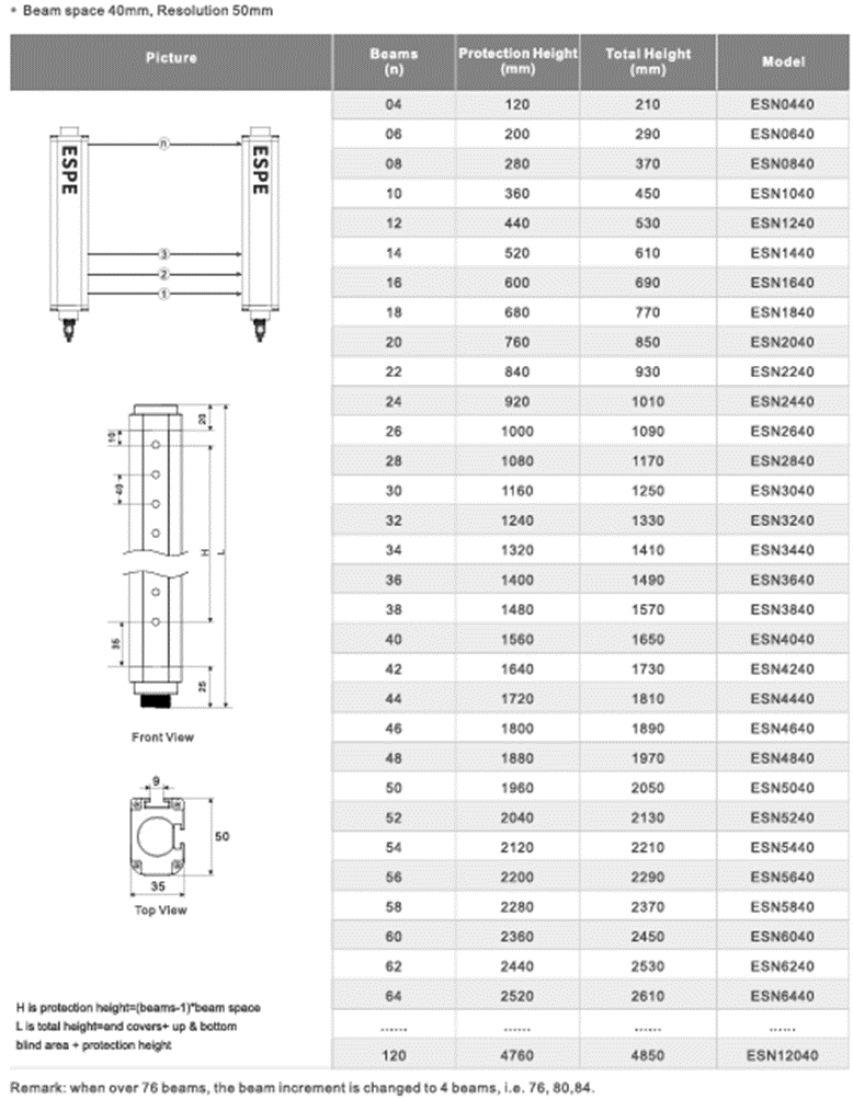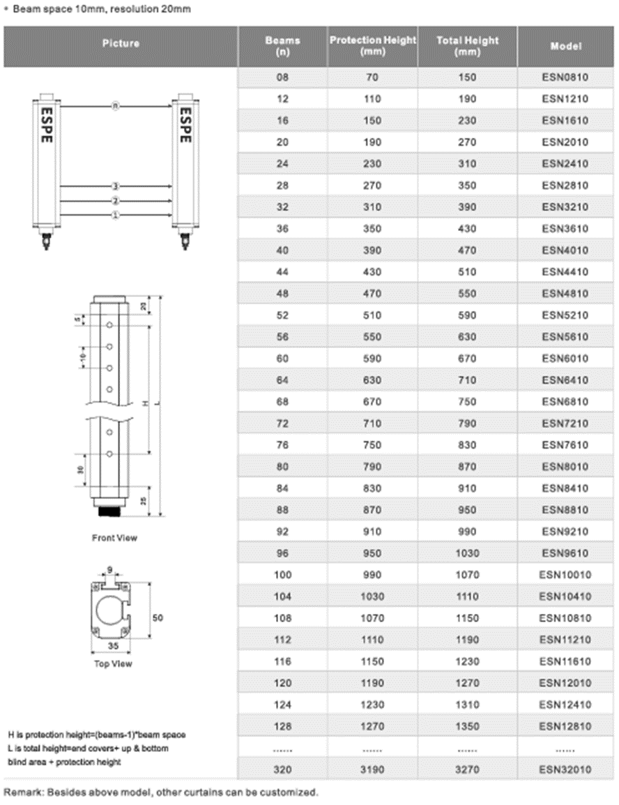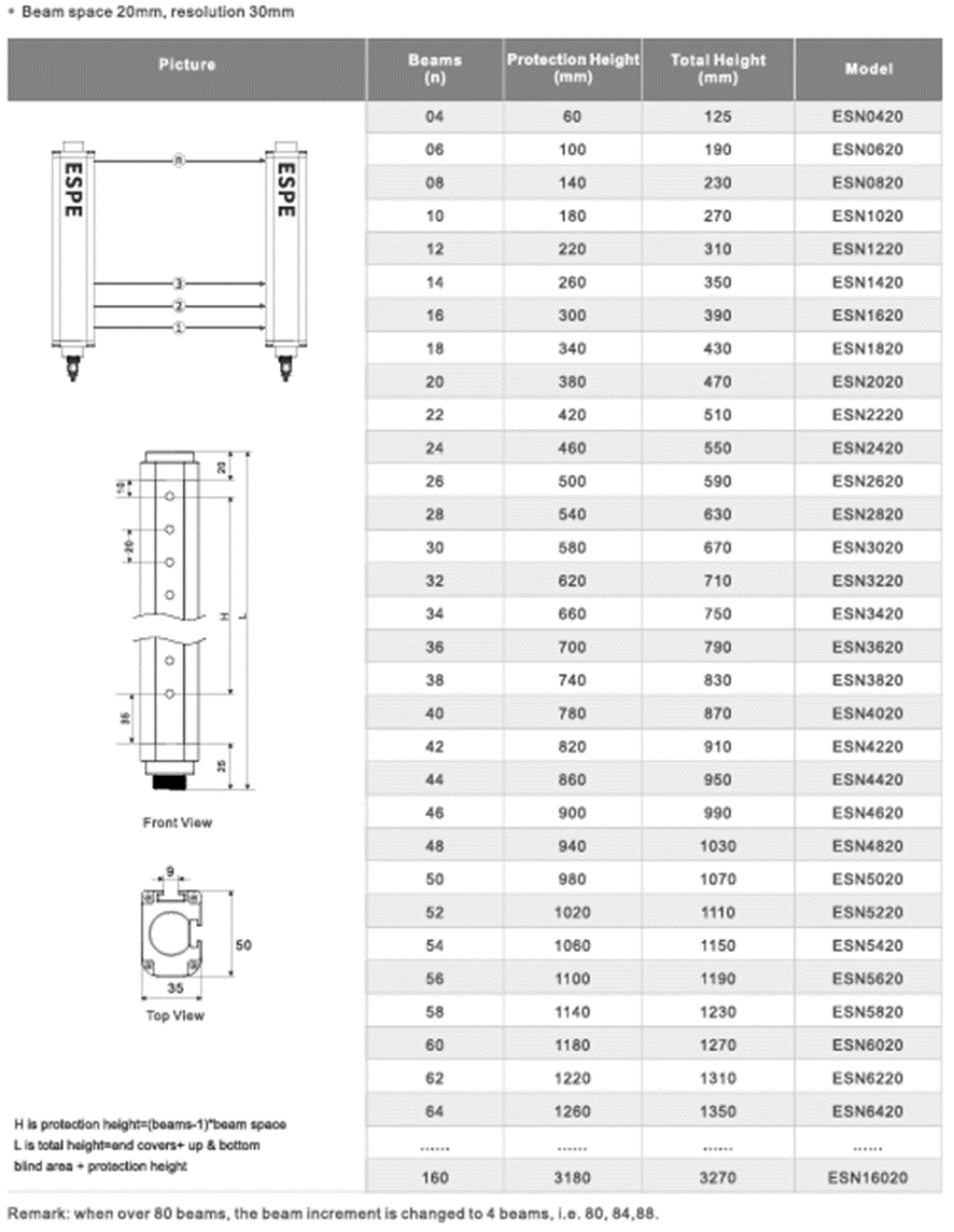 ESN series is independent dual OSSD output design, with self-diagnosis and over current protective circuit function.