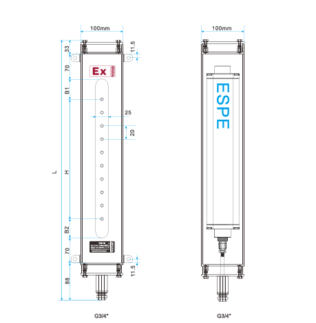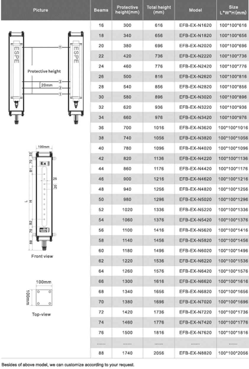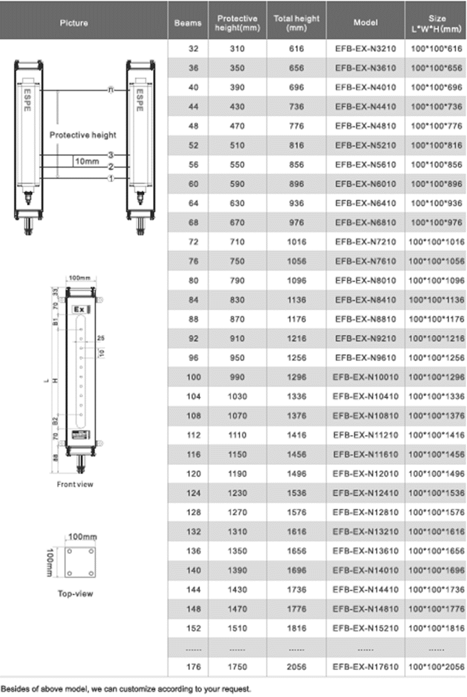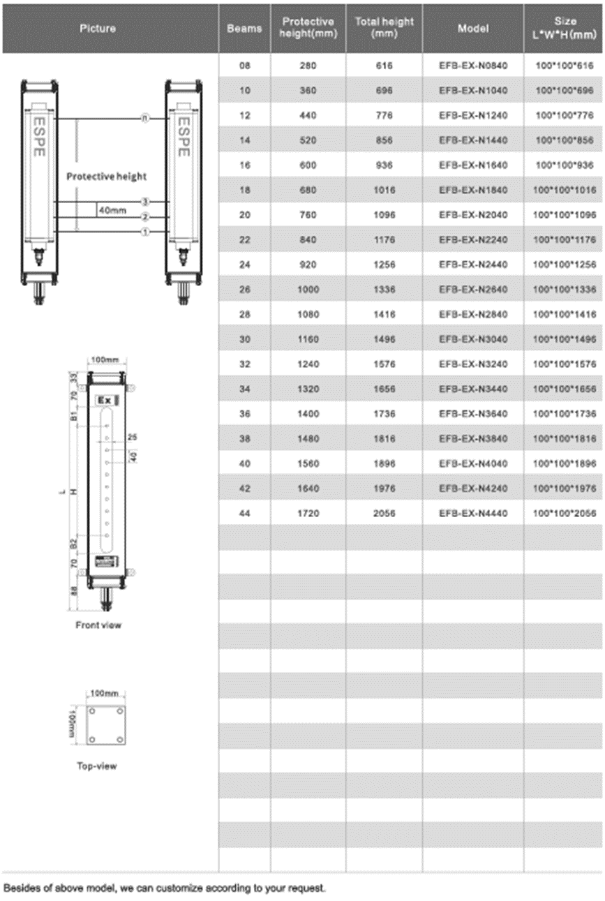 EFB series anti-explosion safety light curtain is mainly used for isolating safety light curtain from explosion environment, which is suitable for hazardous explosive gas environment zone 1 and zone 2, IIA/IIB/IIC level explosive gas environment, combustible dust environment zone 20, zone 21 and zone 22, temperature group is between T1-T6, petrochemical, offshore drilling platforms, medicine, light industry, textile, wine, paint, coating, food, biological engineering and military etc. factory.
