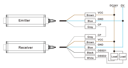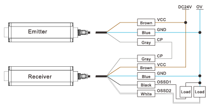 Type of output (OSSD) | PNP/NPN semiconductors, current <200mA, residual voltage: 1V max, leakage current: 1mA max. (Except voltage influenced by lengthen wire) |