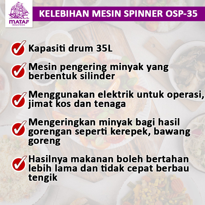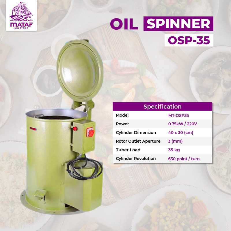 The Mataf OSP-35 Oil Spinner (35L) is designed to filter and remove excess oil from fried foods such as chips, fried chicken, nuggets, and frozen products. With a 35kg cylinder capacity, it is ideal for food factories, catering services, restaurants, and snack producers.