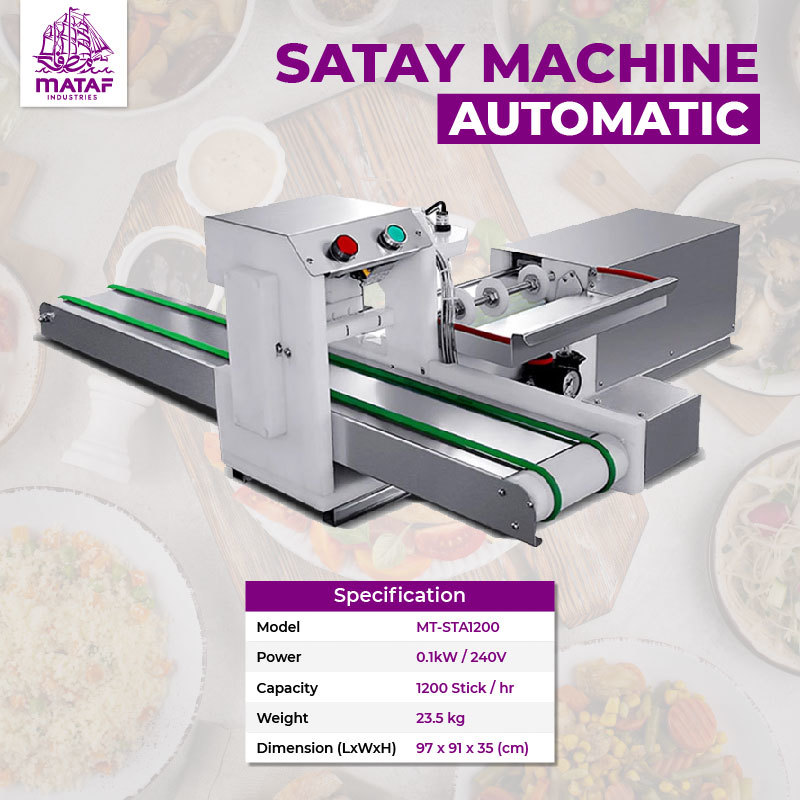 The Mataf STA-1200 Automatic Satay Machine streamlines the process of skewering satay with a production capacity of up to 1200 sticks per hour. It is ideal for satay businesses, catering services, restaurants, hotels, and food factories aiming to boost productivity and maintain consistency.