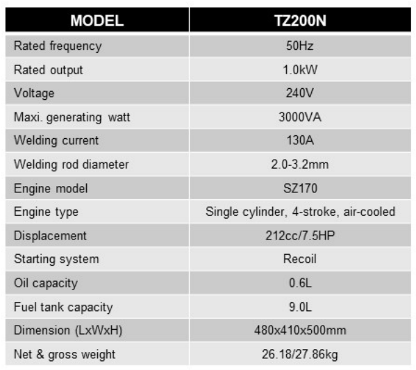 TOKEN TZ200N Inverter Welding Generator Engine SZ170 4-Stroke 212cc 7.5hp Recoil 50Hz 1.0kW 240V 3000VA 130A 2-3.2mm