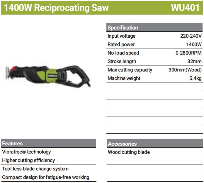 WORX WU401 1400W Reciprocating Saw 2800rpm