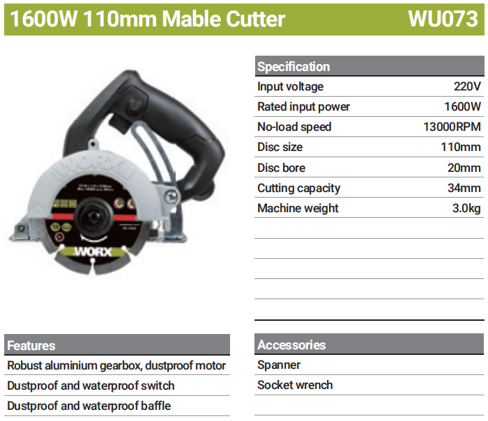 WORX WU073 1600W 110mm Mable Cutter 13000rpm 220V