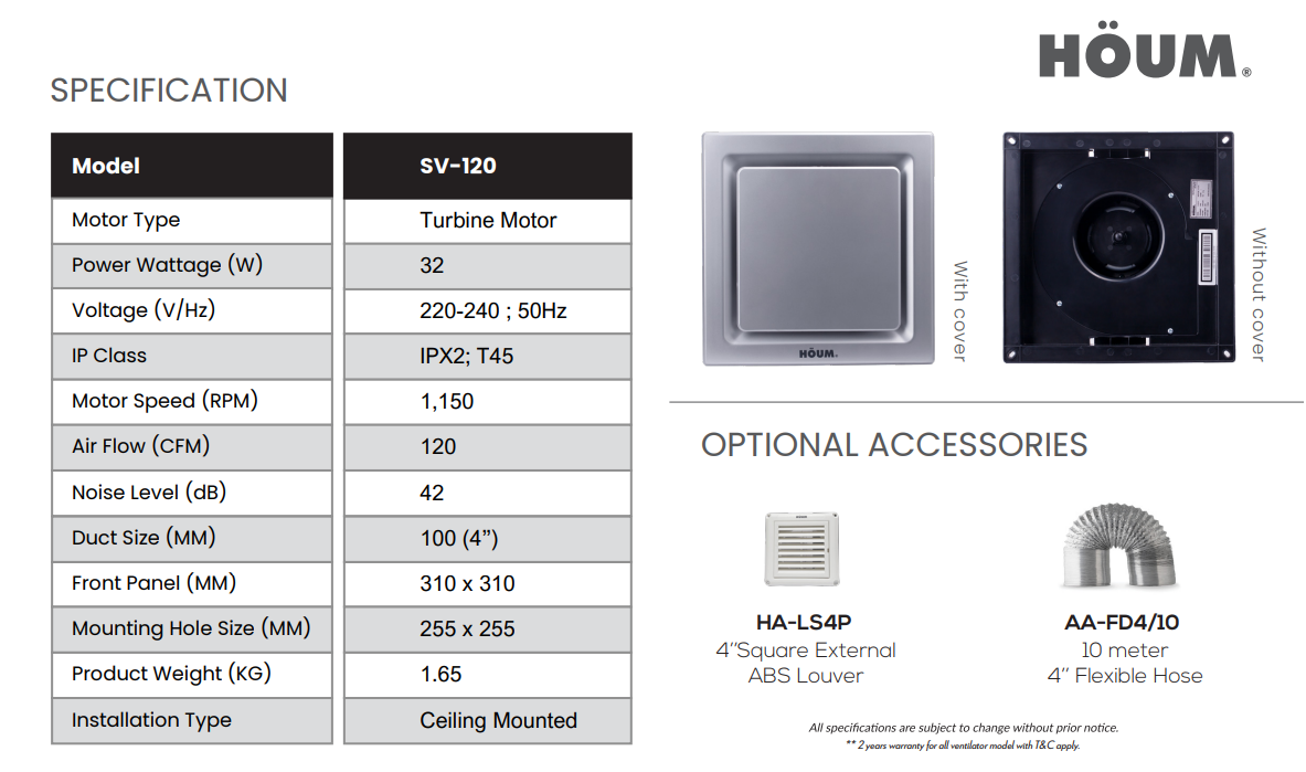 HOUM SV-120 Silent Ceiling Mounted Ventilation Fan