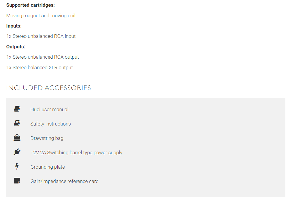 Huei is a stylish, practical and high-performance solution for integrating turntables into Chord Electronics’ (and other) systems and features both unbalanced (RCA) and balanced outputs (XLR) with RCA inputs. A high-quality 12V external power supply is also supplied.