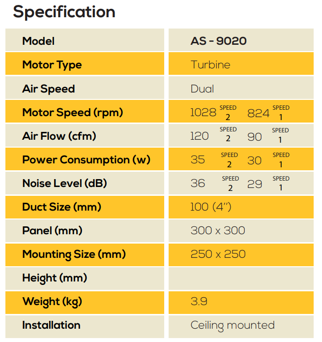 Air Flow (CFM) | 120 (High), 90 (Low) |