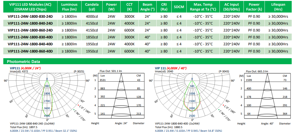 Multiple Beam Angles: Choose between 24° or 40° for focused or wide light distribution.