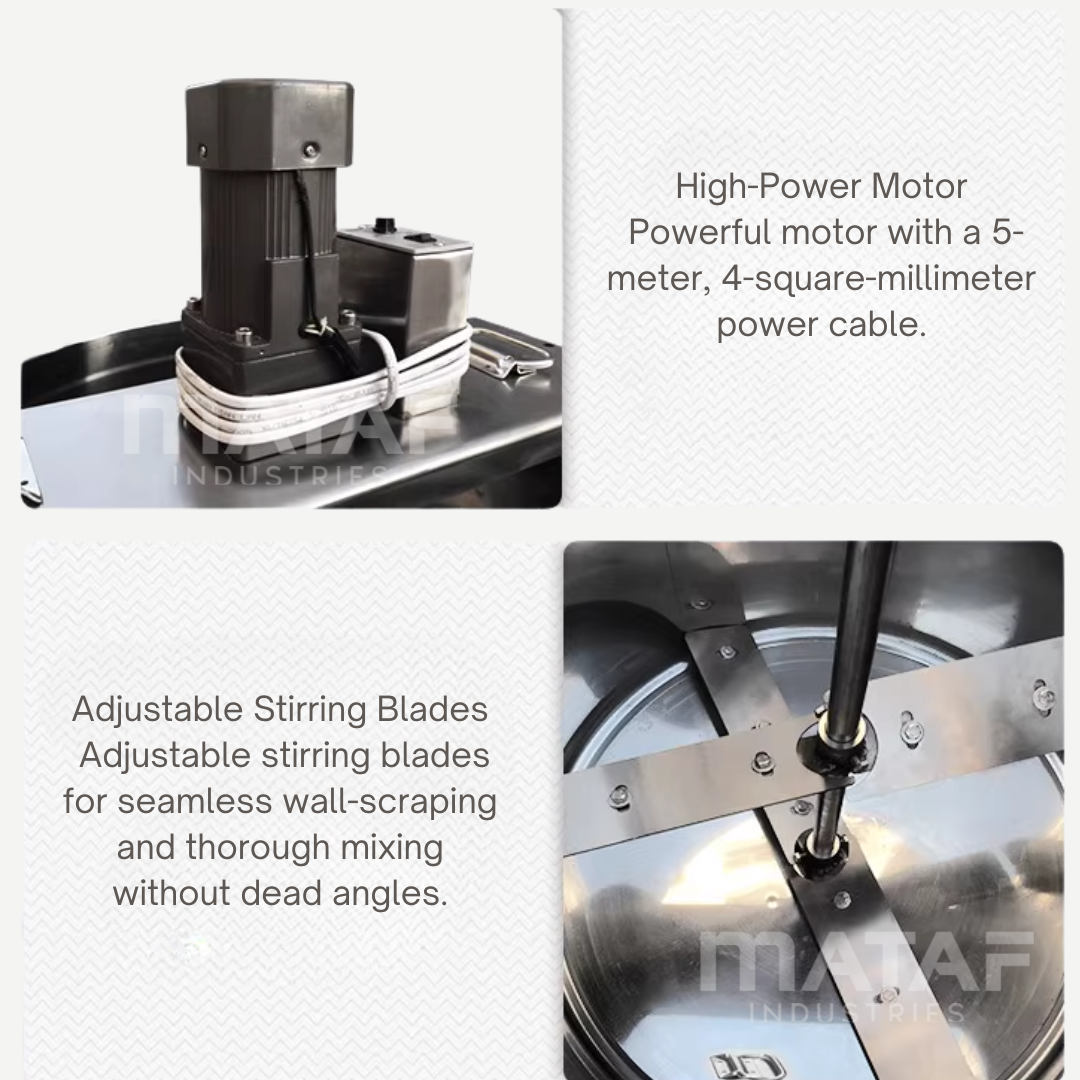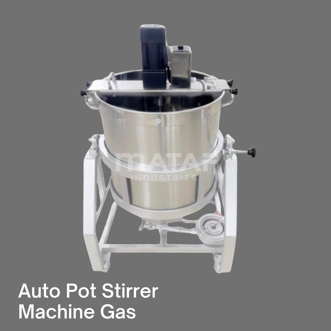 Automatic gas pot stirrer with a food-grade stainless steel body, spring-loaded scraper blades, adjustable mixing shaft, and quick-release design. Ideal for uniform heating and continuous stirring without sticking or burning.