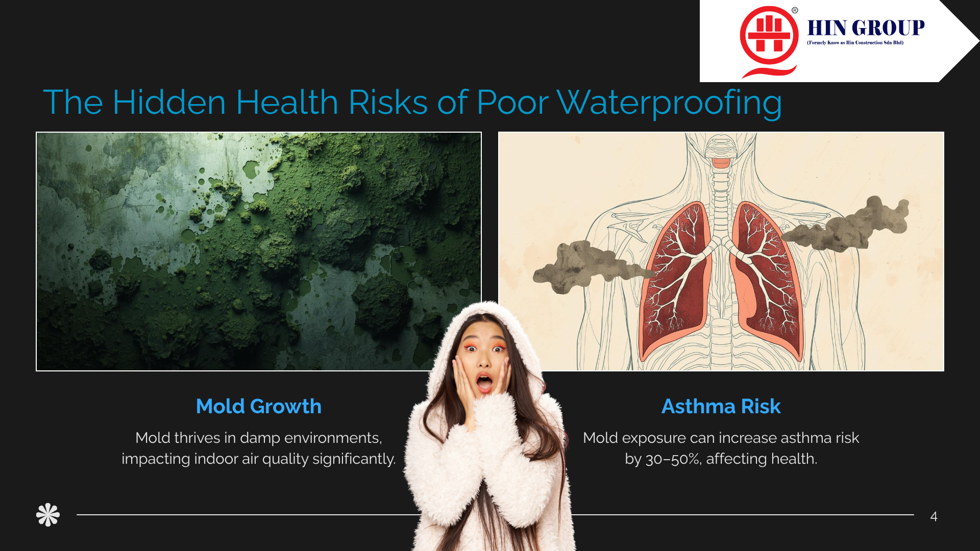 Stop letting water damage threaten your property and health. Visit HIN GROUP or WhatsApp us at 016-2193181 for your free inspection. Our experts will solve your leakage problems without breaking tiles or disrupting your life. Proper waterproofing protects everything you value - it's an investment, not an expense.