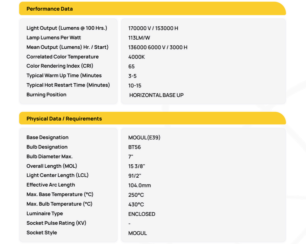 Crafted with BT56 bulb design, this high-intensity discharge (HID) lamp is built to withstand demanding environments, ensuring consistent light output and energy efficiency.