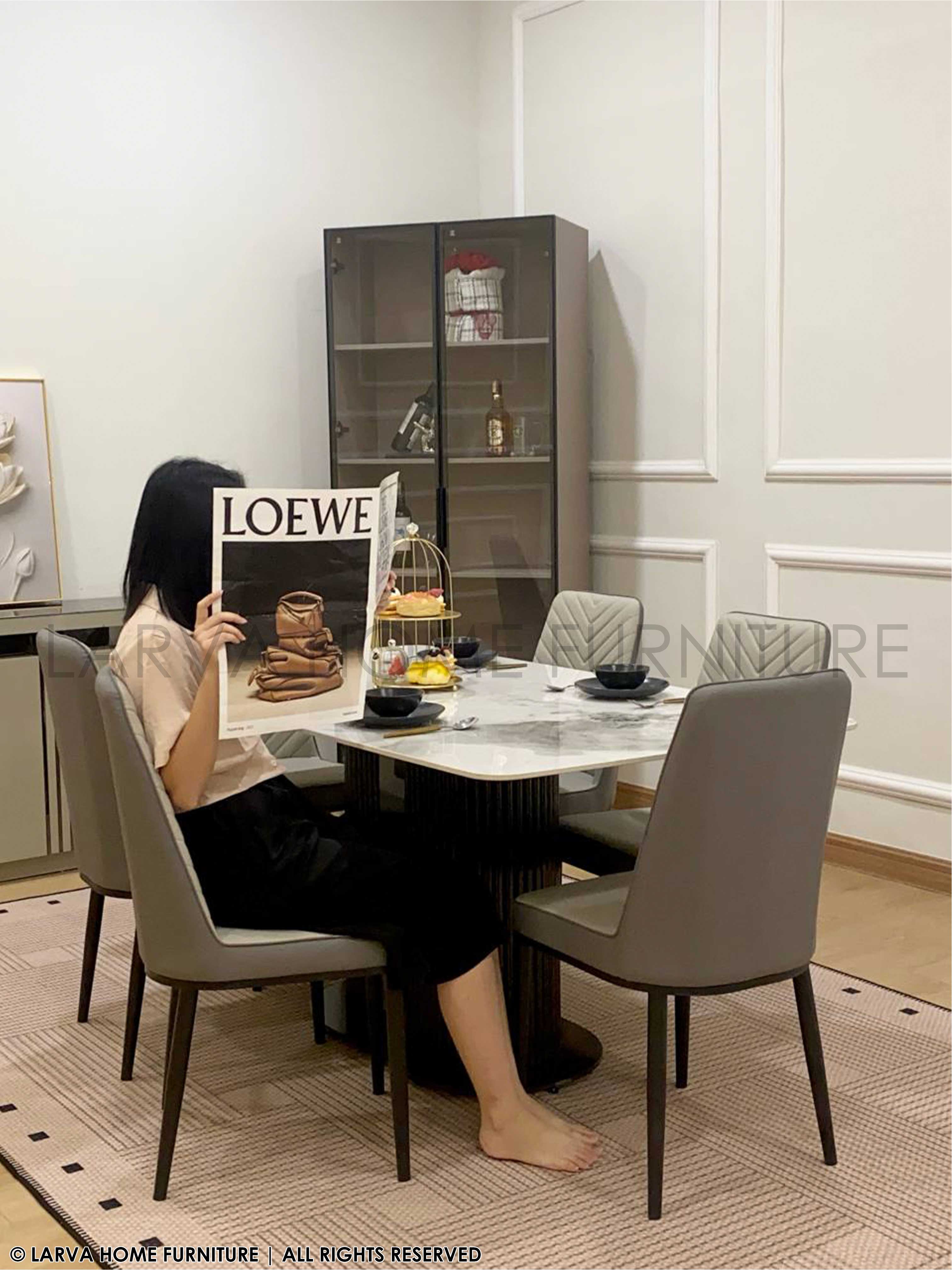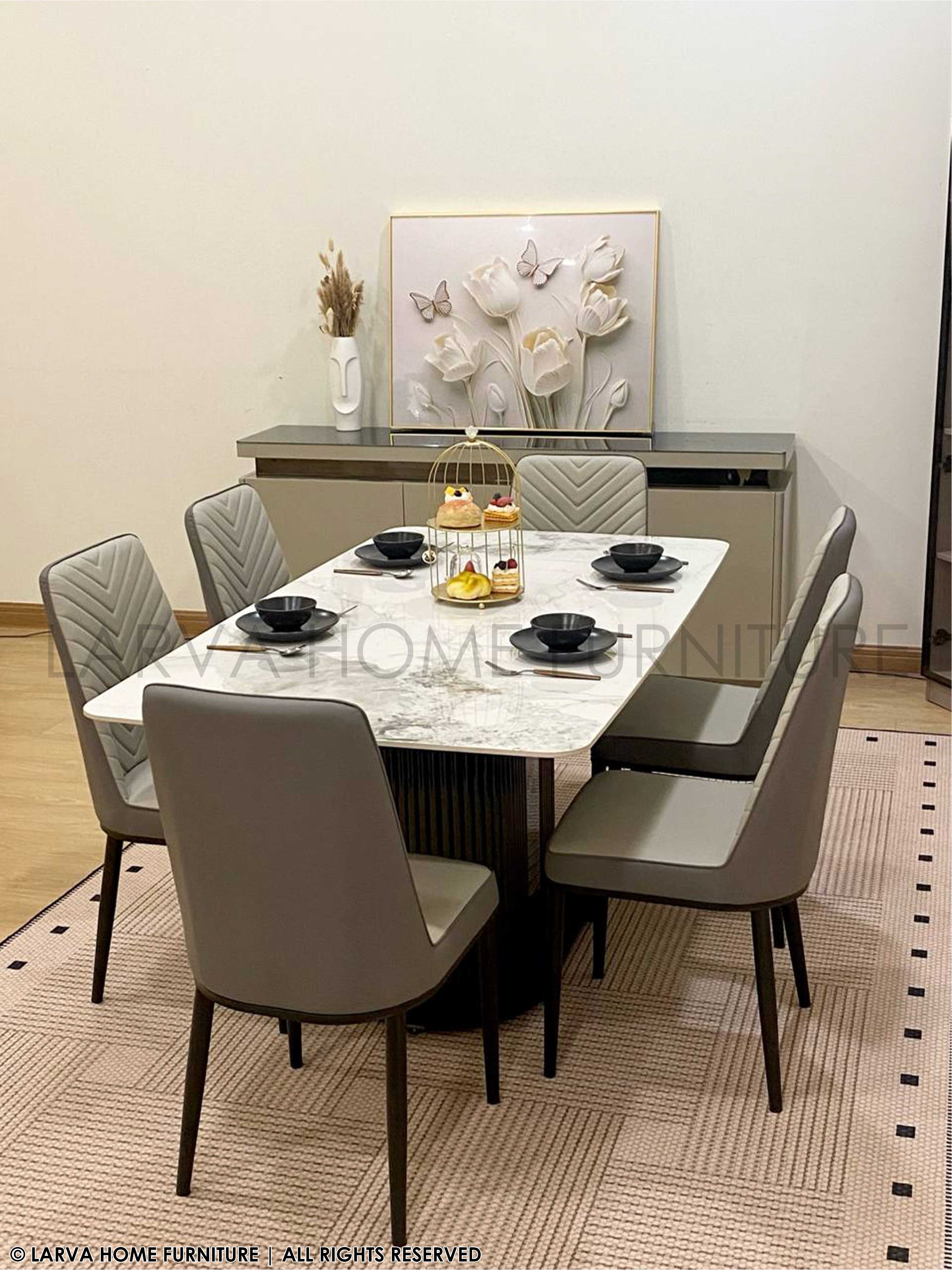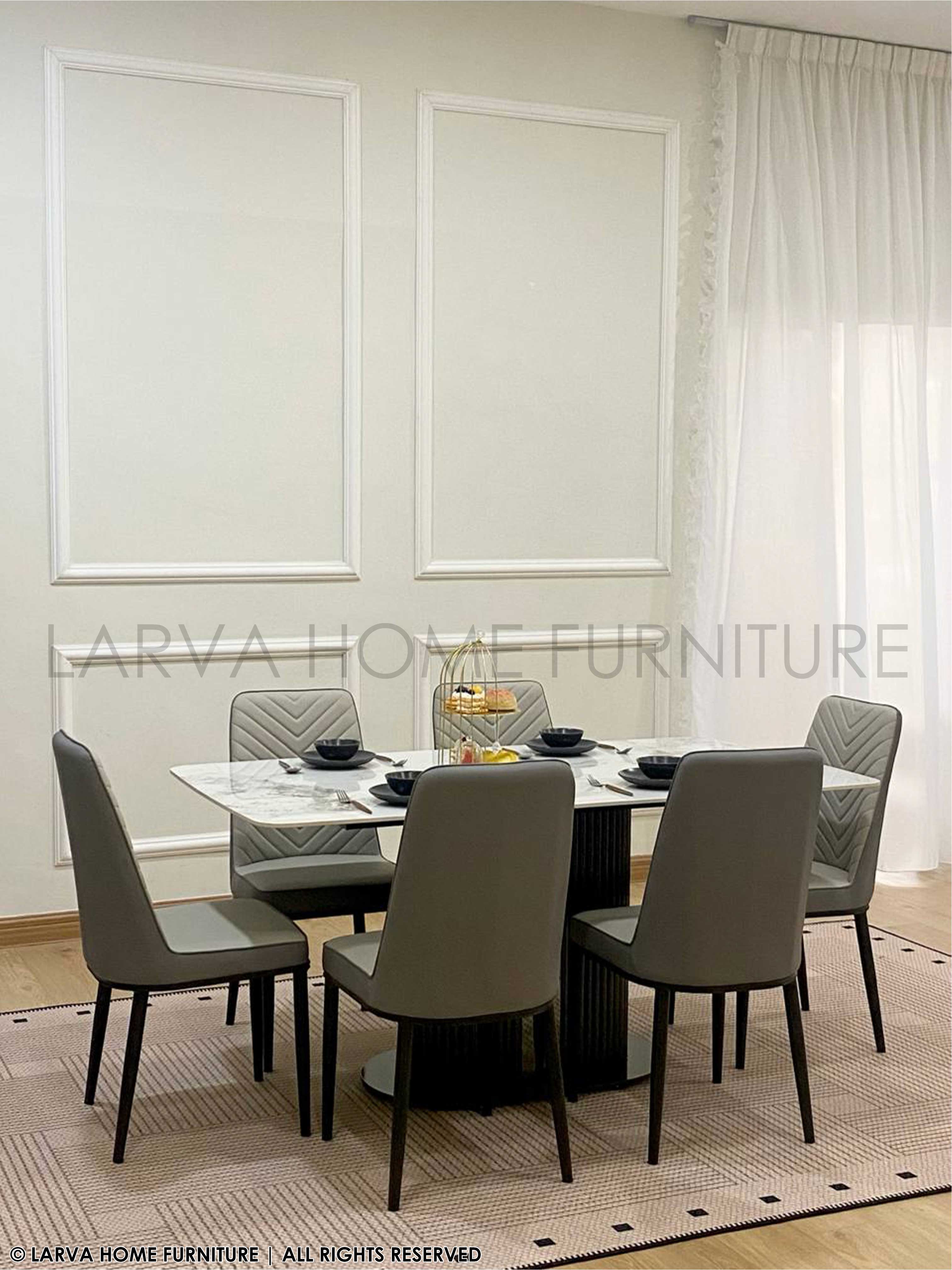 A Yara Dining Table + Greg Dining Chair that brings people closer—crafted to make every meal feel like an occasion. The modern tabletop gleams with quiet luxury, while the cushioned chairs promise lasting comfort through every story shared. Perfect for families who love elegant dining spaces that still feel warm, inviting, and alive with connection.