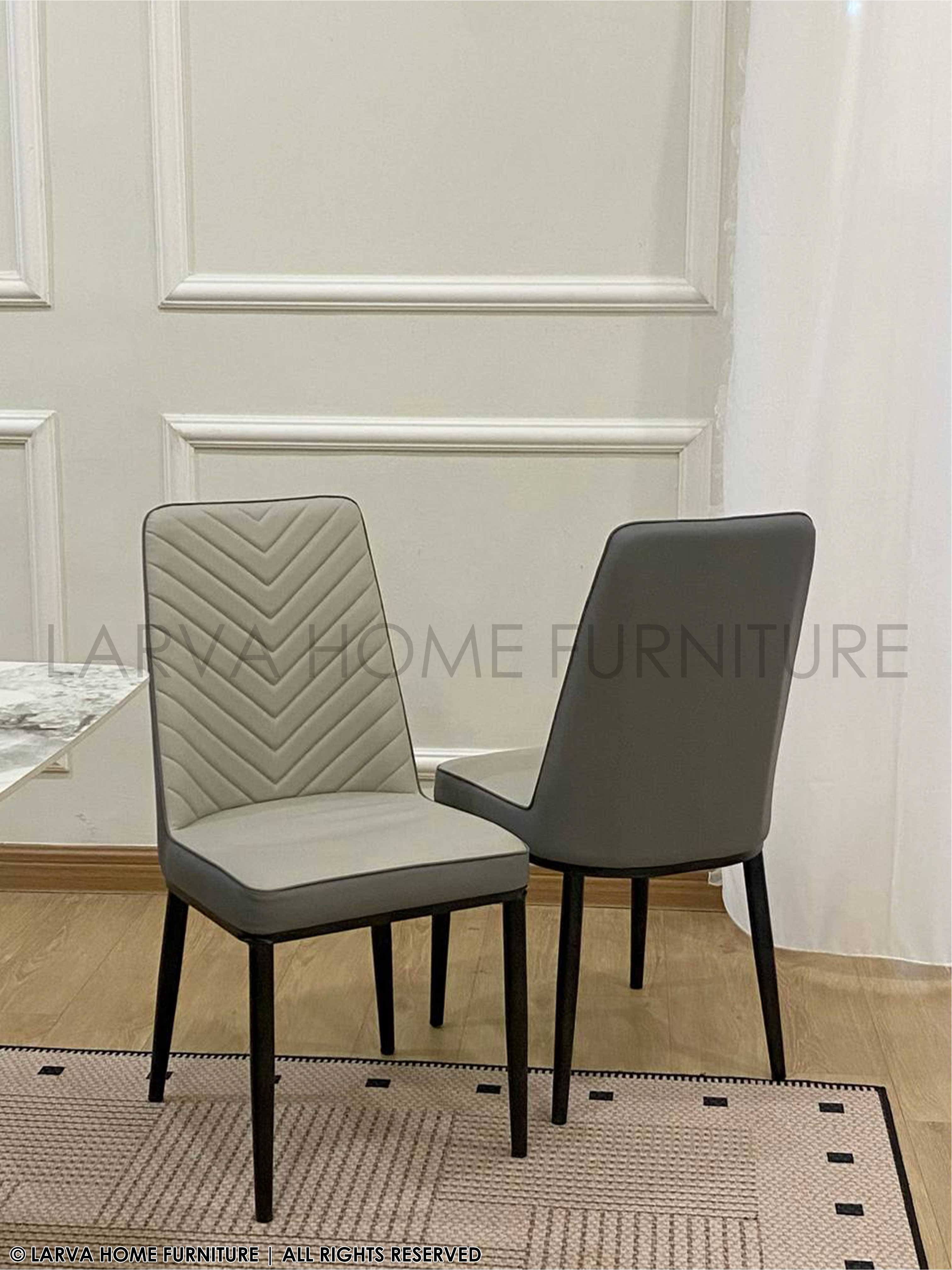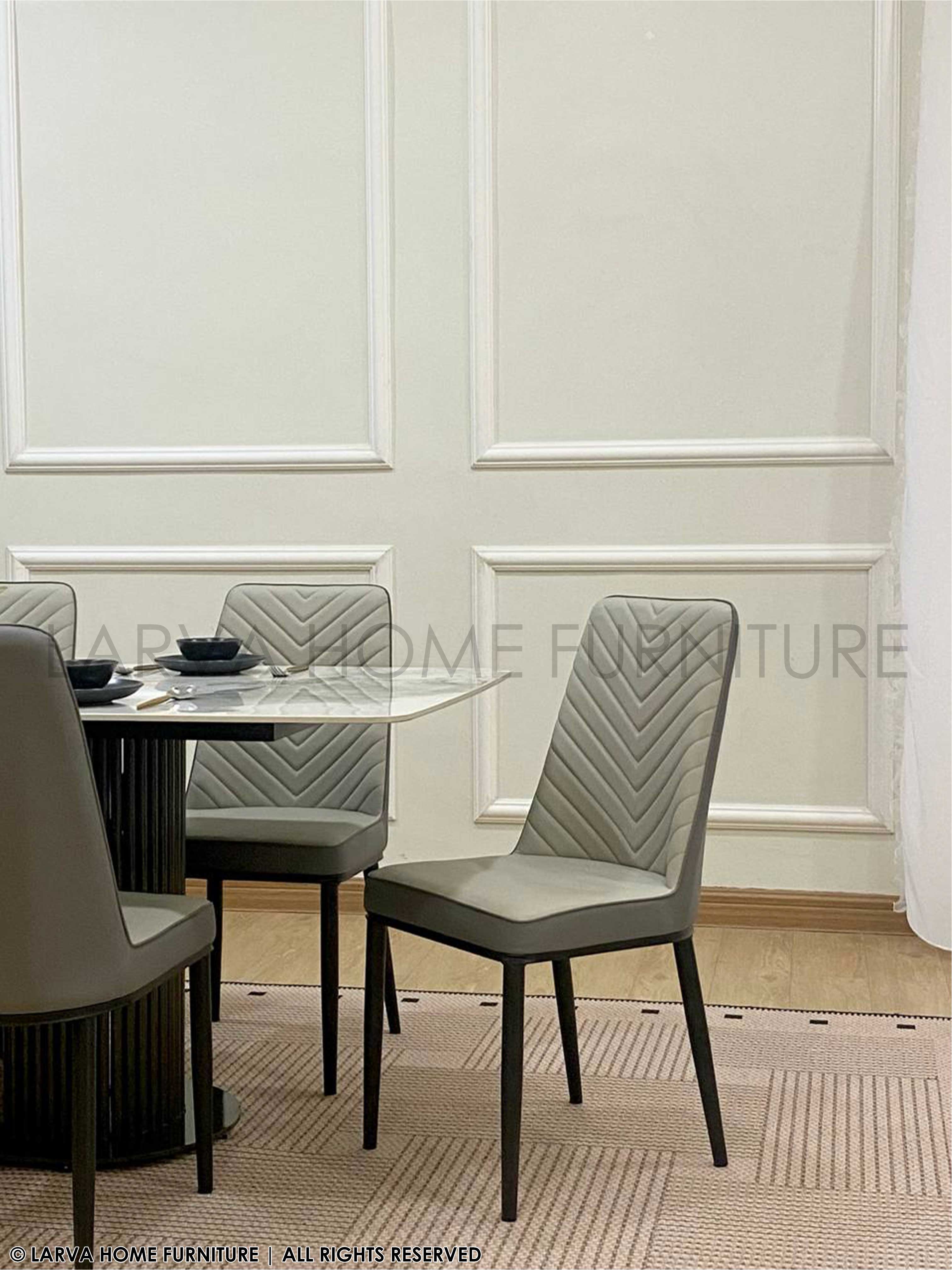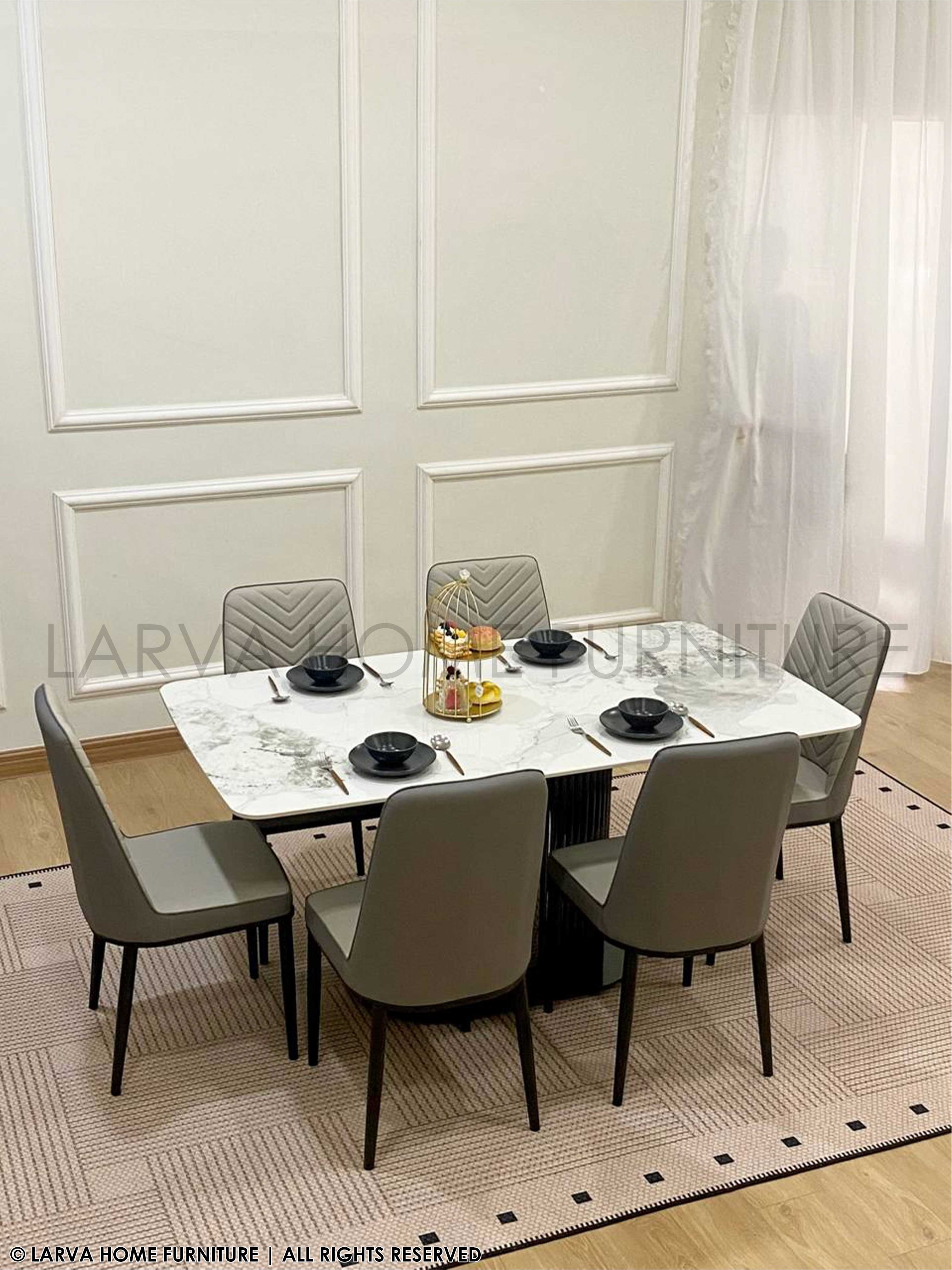 A Yara Dining Table + Greg Dining Chair that brings people closer—crafted to make every meal feel like an occasion. The modern tabletop gleams with quiet luxury, while the cushioned chairs promise lasting comfort through every story shared. Perfect for families who love elegant dining spaces that still feel warm, inviting, and alive with connection.