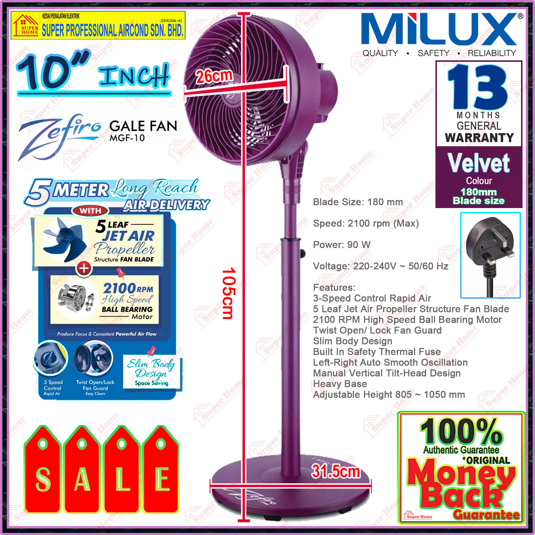 • 1 year general warranty by Milux Malaysia