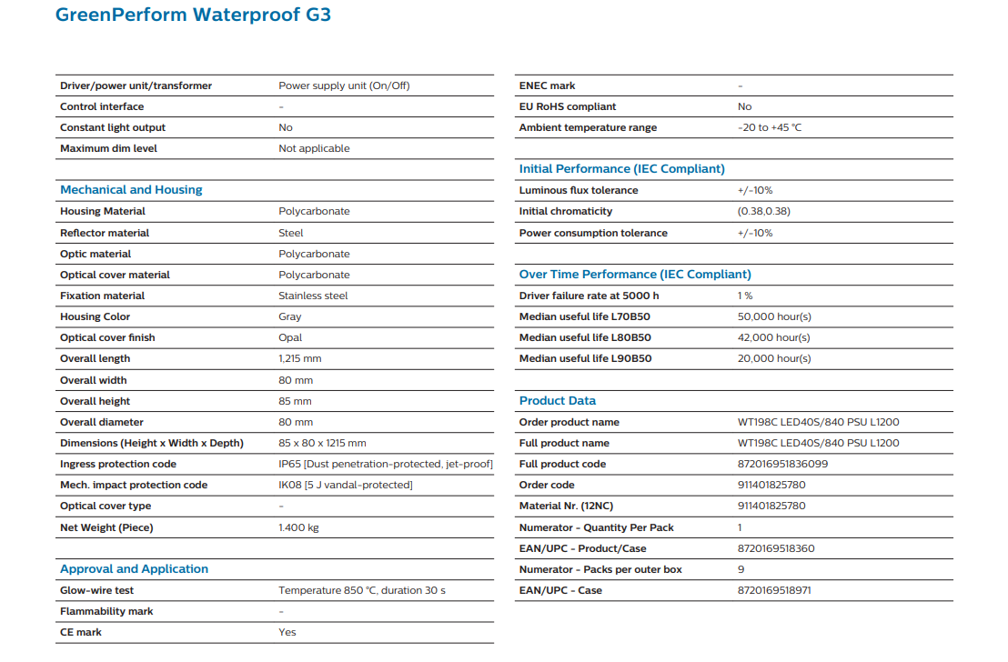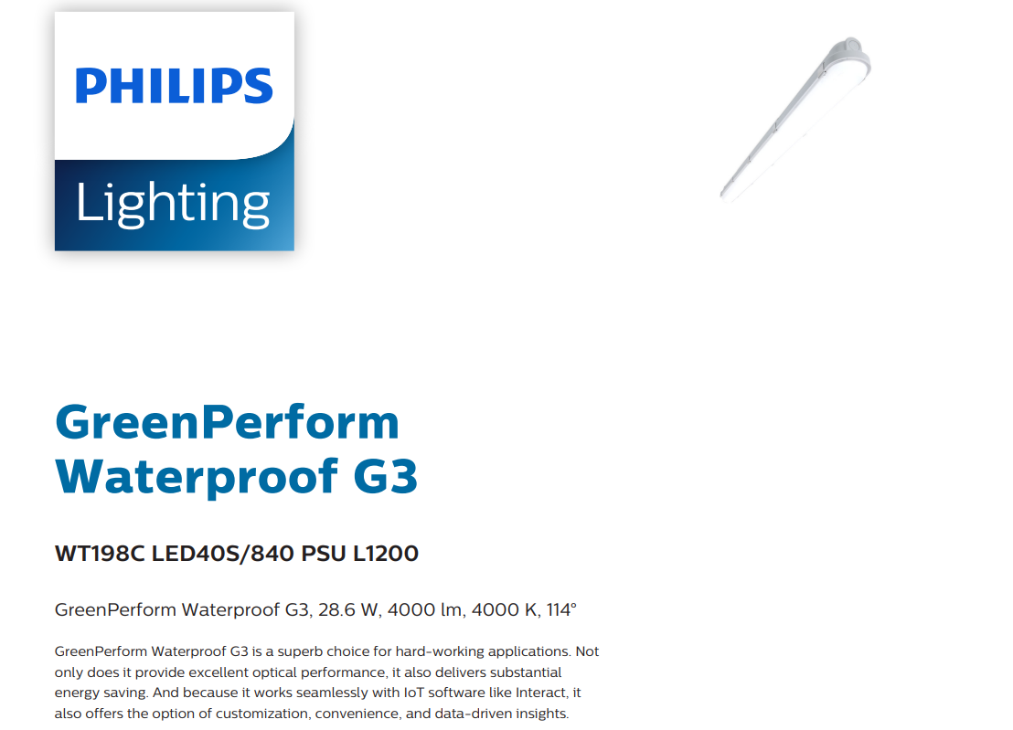 The PHILIPS WT198C GreenPerform Waterproof Batten G3 stands out for its high lumen efficiency, durable IP65 protection, and true color rendering (CRI80). It offers the perfect combination of performance, reliability, and energy savings — making it the best choice for businesses looking for long-term, maintenance-free lighting solutions.