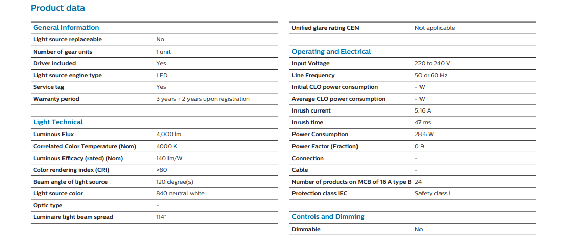 The PHILIPS WT198C GreenPerform Waterproof Batten G3 delivers 4000 lumens of high-quality illumination with a neutral white (4000K) color temperature, ensuring clear and comfortable visibility in every environment. Its IP65-rated housing guarantees protection against water jets and dust, making it perfect for industrial, warehouse, car park, and commercial lighting installations.