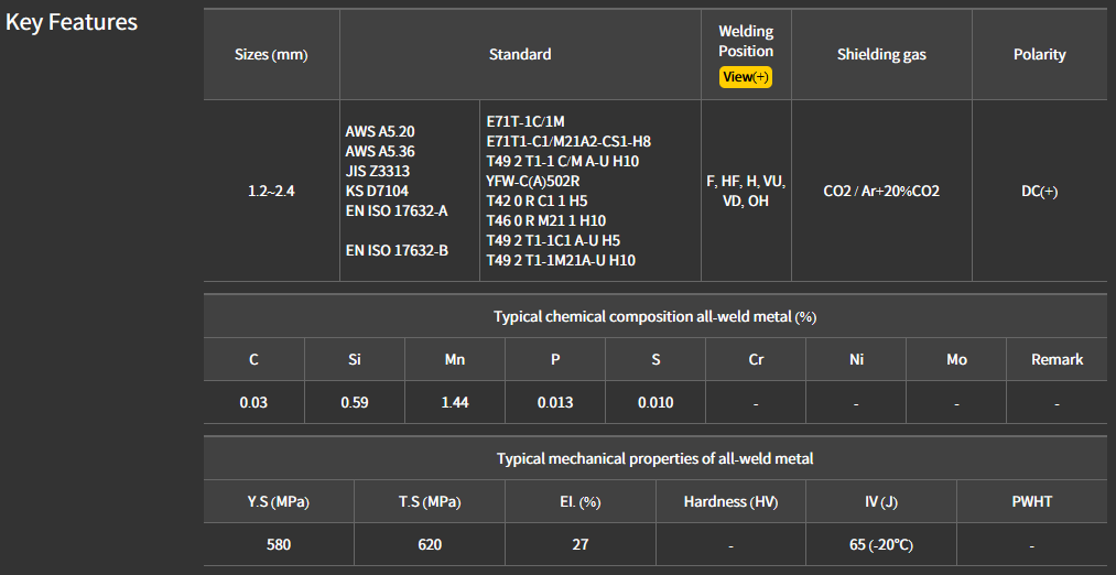 - AWS: A5.36 : E71T1-C1/M21A2-CS1-H8