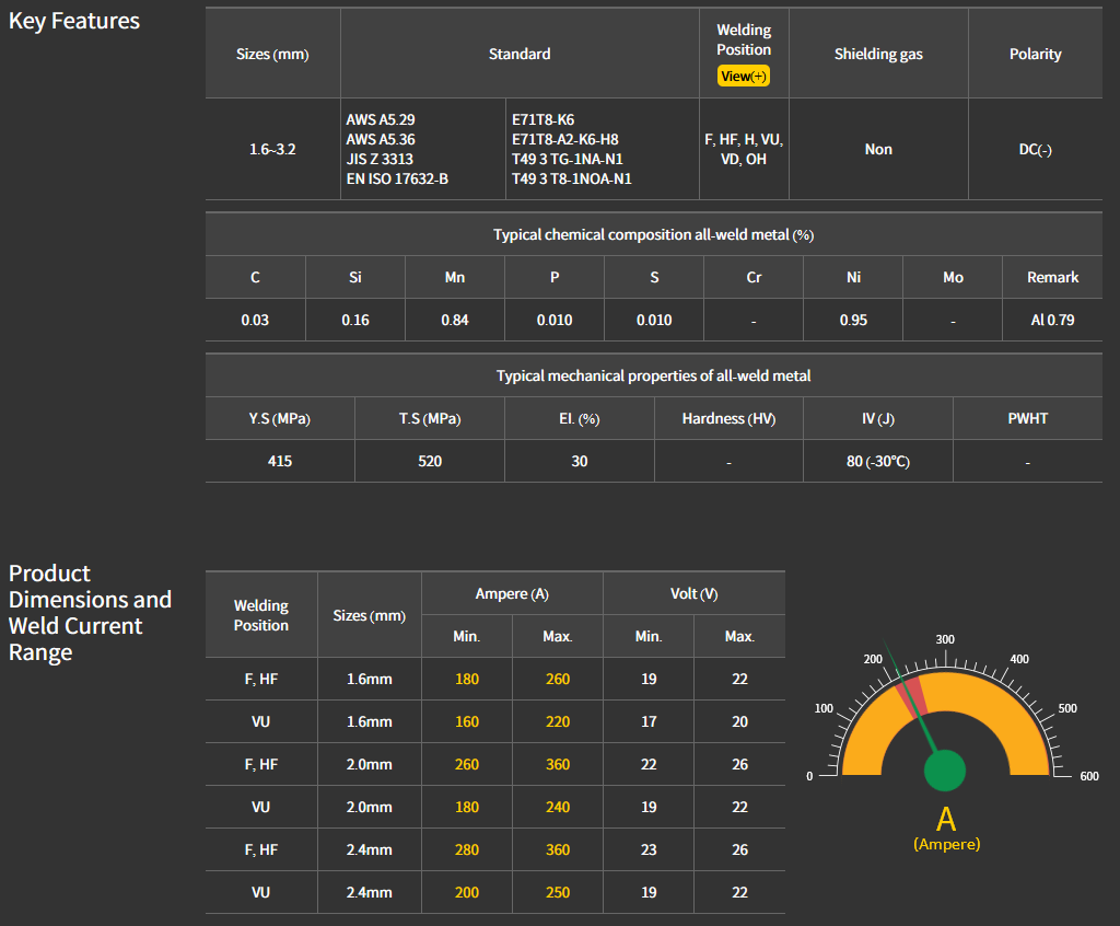 For 490MPa high tensile steel and self-shielded wire to facilitate welding outdoors. Good impact toughness at low temperature (0.5~1% Ni contained)